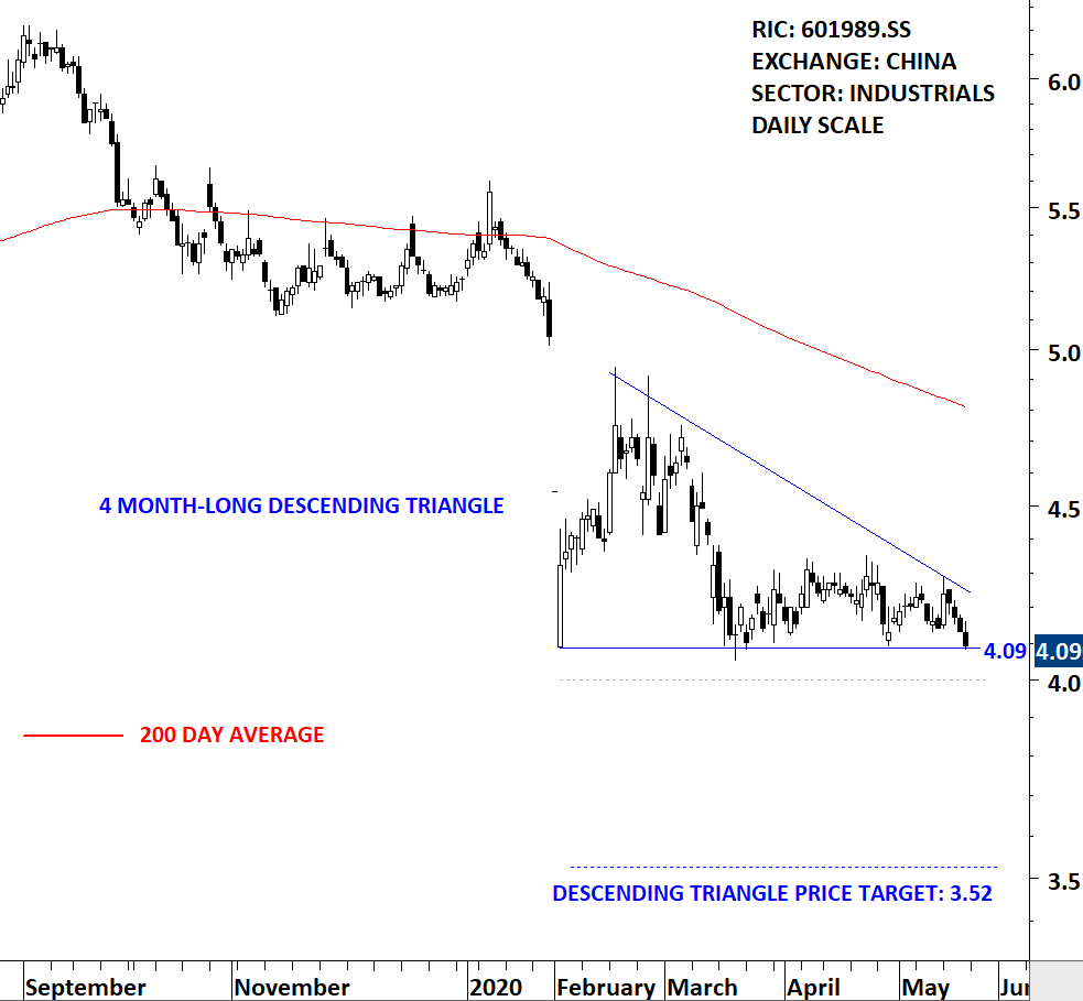 China Shipbuilding Industry Company Limited is a China-based company, principally engaged in the research and development, design and manufacture of ships. The Company is engaged in the manufacturing, repairing and refitting of ships. The stock is listed on the Shanghai Stock Exchange. Price chart formed a 4 month-long descending triangle with the horizontal boundary acting as strong support at 4.09 levels. The horizontal boundary was tested several times over the course of the chart pattern. A daily close below 4.00 levels will confirm the breakdown from the 4 month-long descending triangle with the possible chart pattern price target of 3.52 levels. (Learn more: Video Tutorial)