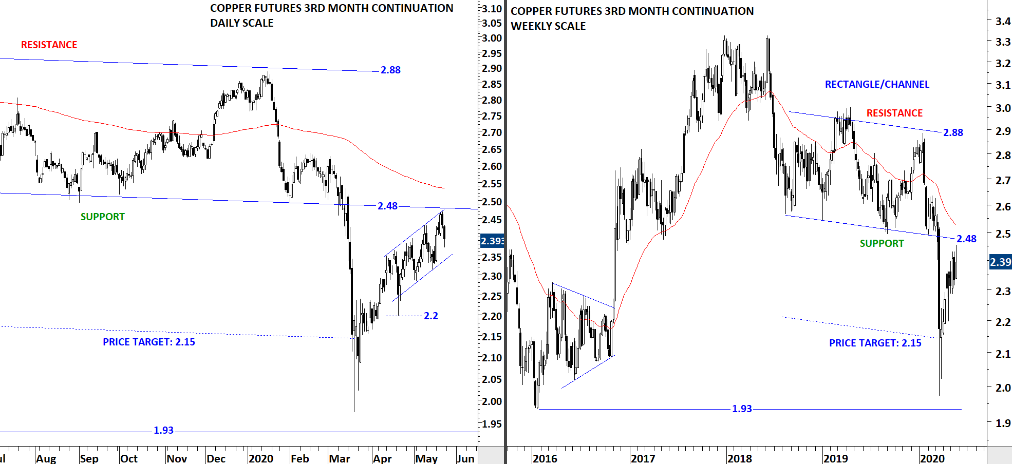 After breaking down support at 2.48 levels and testing 1.93 levels, Copper prices had a sharp rebound. Previous support becomes the new resistance. Copper tested the strong resistance area. 2.48 and the 200-day moving average at 2.54 are forming a resistance zone. Last one month’s price action can be identified as an upward trend channel.