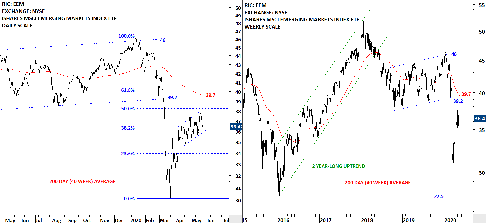The benchmark for the Emerging Markets performance, the iShares MSCI Emerging Markets Index ETF (EEM) was another price chart that resumed its rebound from oversold conditions. The ETF is in a downtrend below its 200-day average. A short-term consolidation might be developing on the daily scale price chart. Unlike the ACWI ETF, the rebound on EEM was weak, recovering almost 50% of the Jan-Mar sell-off. Similar to ACWI ETF, last one months price action can be identified as a rising trend channel. Due to weakness in Chinese equities EEM pulled back to the lower boundary of the rising trend channel. Strong resistance area is between 39.2 and 39.7.