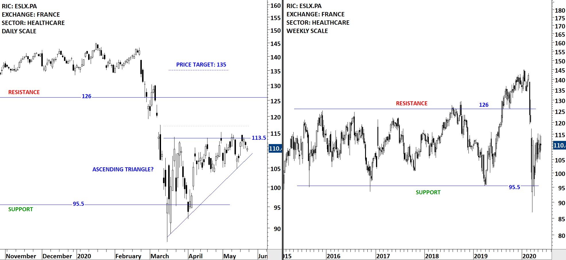 EssilorLuxottica SA, formerly known as Essilor International Compagnie Generale D Optique SA, is a France-based ophthalmic company. The Company designs, manufactures and markets a range of lenses, frames and sunglasses to improve and protect eyesight. The stock is listed on the Paris Stock Exchange. Price chart formed a multi year-long consolidation with the horizontal boundary acting as strong support at 95.5 levels. Stock rebounded from the strong support. 113.5 levels will act as short-term resistance for the possible ascending triangle reversal chart pattern. A daily close above 117 levels can confirm the breakout with the price target of 135 levels. (Learn more: Support & Resistance)