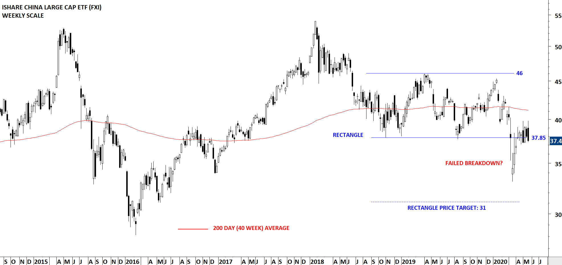 FXI, the Ishares China Large CAP ETF listed on the NYSE has been trading in a range between 37.85 and 46 levels. In March the ETF experienced a sharp sell-off following Global markets weakness. The rebound was sharp. If we see FXI holding inside the channel in the following weeks I will treat this as a positive sign and expect the new trading range to become 37.85-46. Failure to hold inside the channel (rectangle) can result in a re-test of March lows.