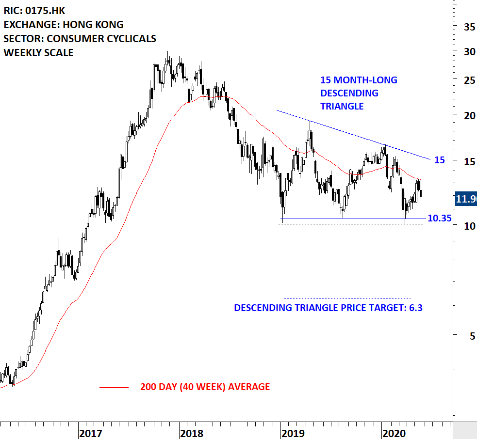 Geely Automobile Holdings Limited is an investment holding company principally engaged in automobiles. The major products include Emgrand electric vehicles (EVs), Emgrand grand luxury (GL), Geely GC9, Vision sports utility vehicles (SUVs), Emgrand grand super (GS), Geely Kingkong Series, Geely Boyue, Geely Panda, Free Cruiser, New Emgrand, Vision Series, among others. The stock is listed on the Hong Kong Stock Exchange. Price chart formed a 15 month-long descending triangle with the horizontal boundary acting as strong support at 10.35 levels. The horizontal boundary was tested several times over the course of the chart pattern. A daily close below 10.0 levels will confirm the breakdown from the 15 month-long descending triangle with the possible chart pattern price target of 6.3 levels. (Learn more: Video Tutorial)