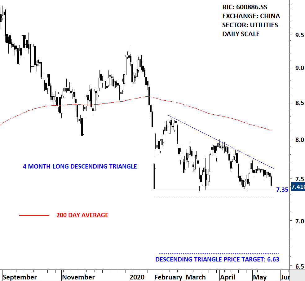 SDIC Power Holdings CO., LTD. is a China-based company, principally engaged in the investment, construction, operation and management of electric power plants. The Company operates hydropower plants, thermal power plants, wind power plants and photovoltaic power plants. The Company also provides consulting services. The stock is listed on the Shanghai Stock Exchange. Price chart formed a 4 month-long descending triangle with the horizontal boundary acting as strong support at 7.35 levels. The horizontal boundary was tested several times over the course of the chart pattern. A daily close below 7.27 levels will confirm the breakdown from the 4 month-long descending triangle with the possible chart pattern price target of 6.63 levels. (Learn more: Video Tutorial)