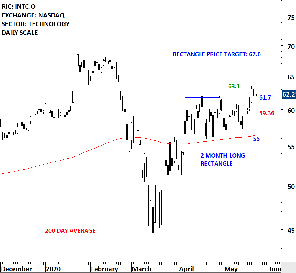 Intel Corporation is engaged in designing and manufacturing products and technologies, such as the cloud. The stock is listed on the Nasdaq Stock Exchange. Price chart formed a 2 month-long rectangle with the horizontal boundary acting as strong resistance at 61.7 levels. The horizontal boundary was tested several times over the course of the chart pattern. The daily close above 62.9 levels confirmed the breakout from the 2 month-long rectangle with the possible chart pattern price target of 67.6 levels. (Learn more: Video Tutorial)
