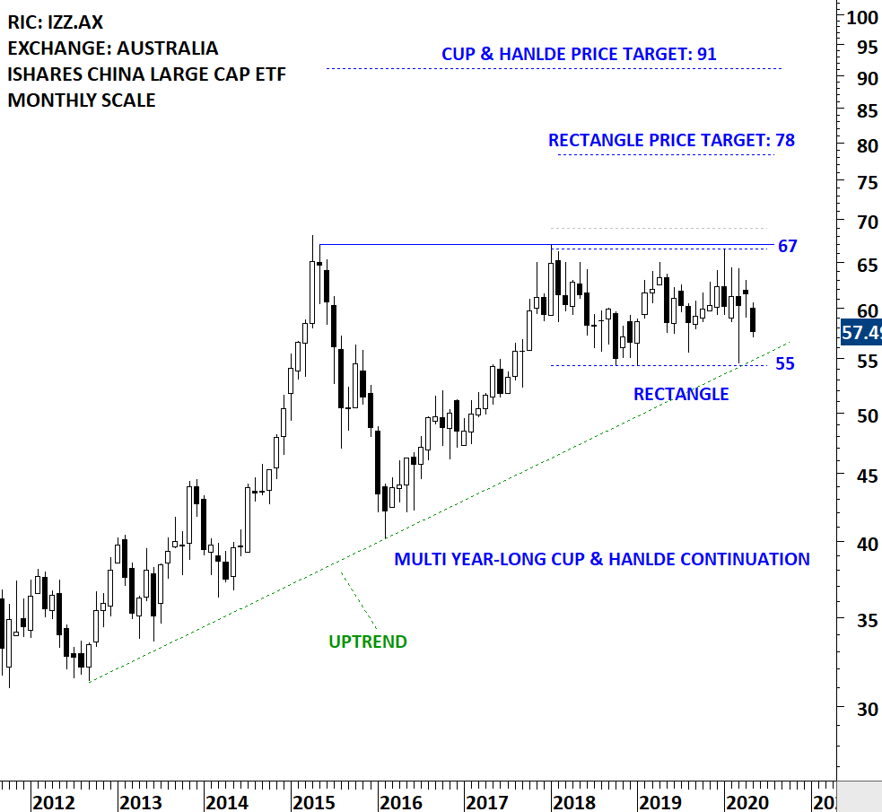 iShares China Large-Cap ETF (the Fund) is an exchange-traded fund. The Fund seeks investment results that correspond generally to the price and yield performance, before fees and expenses, of the FTSE China 25 Index (the Underlying Index). The Fund’s portfolio of sectors include Financials, Telecommunication, Oil & gas, Technology and Consumer goods. The ETF is listed on the Australia Stock Exchange. Price chart formed a multi year-long cup & handle continuation with the horizontal boundary acting as strong resistance at 67.00 levels. The horizontal boundary was tested several times over the course of the chart pattern. The handle part of the chart pattern is possibly a rectangle. A daily close above 69.00 levels will confirm the breakout from the multi year-long cup & handle continuation with the possible chart pattern price target of 91.00 levels. Rectangle chart pattern price target stands at 78 levels. (Learn more: Video Tutorial)