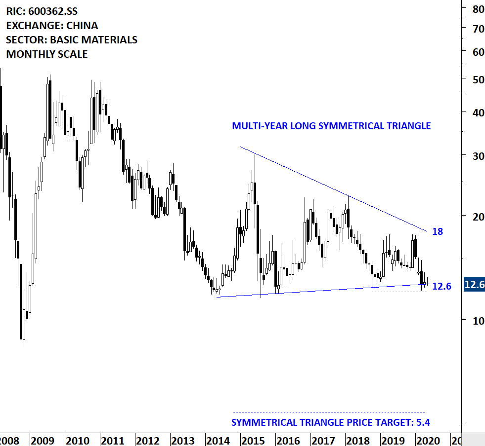 Jiangxi Copper Company Limited is a China-based company, principally engaged in the mining, smelting and processing of copper. The Company is also engaged in the extraction and processing of precious metals and dissipated metals, sulfur chemical industry business, and financial and trading businesses. The stock is listed on the Shanghai Stock Exchange. Price chart formed a multi year-long symmetrical triangle with the lower boundary acting as support at 12.6 levels. The lower boundary was tested several times over the course of the chart pattern. A daily close below 12.0 levels will confirm the breakdown from the multi year-long symmetrical triangle with the possible chart pattern price target of 5.4 levels. (Learn more: Video Tutorial)