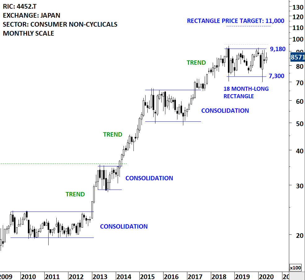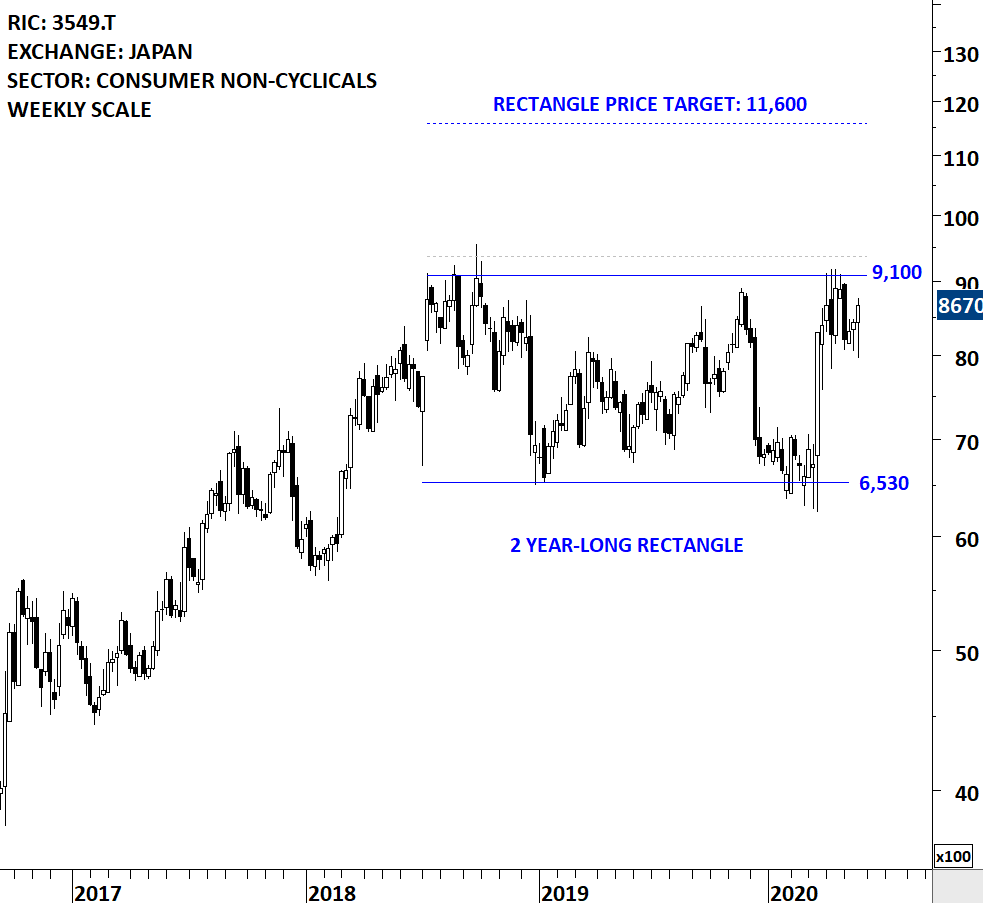 Kao Corporation is a Japan-based company engaged in the manufacture and sale of consumer products and chemical products. The stock is listed on the Tokyo Stock Exchange. Price chart formed an 18 month-long rectangle with the horizontal boundary acting as strong resistance at 9,180.00 levels. The horizontal boundary was tested several times over the course of the chart pattern. A daily close above 9,500.0 levels will confirm the breakout from the 18 month-long rectangle with the possible chart pattern price target of 11,000.0 levels. Please note that this stock has a tendency to form well-defined lengthy consolidation ranges that are followed by strong trend periods. Breakout from the latest consolidation can prove to be one of those trend periods. (Learn more: Video Tutorial)