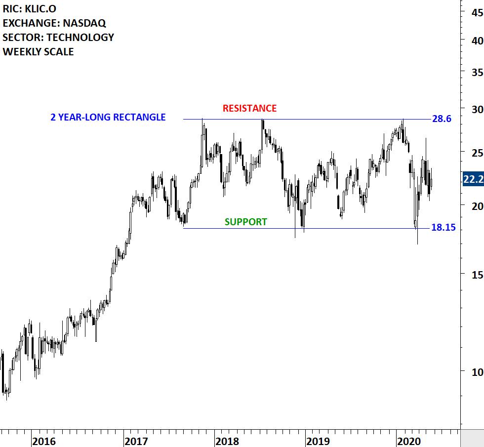 Kulicke and Soffa Industries, Inc. designs, manufactures and sells capital equipment and expendable tools used to assemble semiconductor devices, including integrated circuits (ICs), high and low powered discrete devices, light-emitting diodes (LEDs) and power modules. The stock is listed on the Nasdaq Stock Exchange. Price chart formed a 2 year-long rectangle with the horizontal boundaries acting as strong support at 18.15 levels and resistance at 28.6 levels. Both boundaries were tested several times over the course of the chart pattern. Until there is a decisive breakout from the 2 year-long rectangle, this chart offers trading opportunity between well-defined boundaries. (Learn more: Support & Resistance)