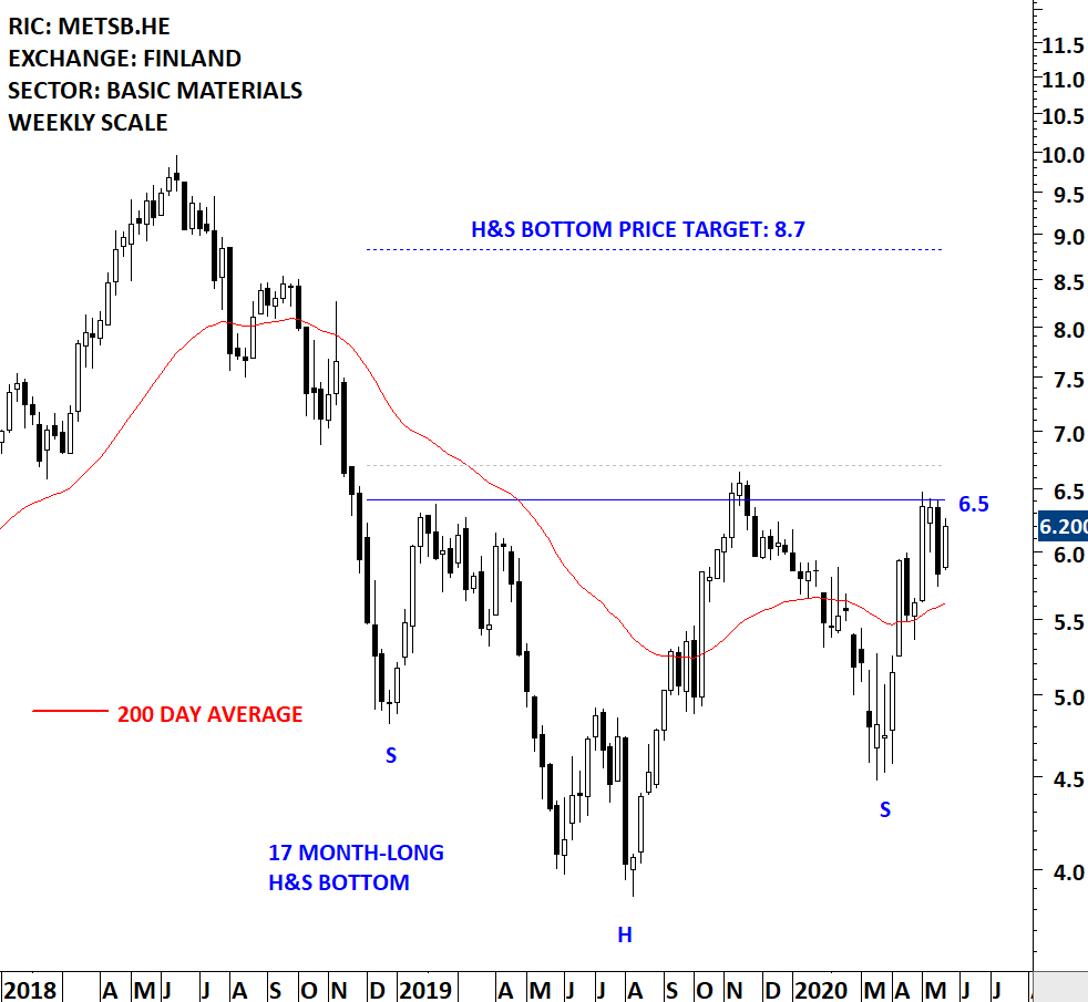 Metsa Board Oyj (Metsa Board Corporation), formerly M-real Corporation, is a Finland-based company engaged in the production, marketing and sale of primary fiber paperboard and paper products. The stock is listed on the Helsinki Stock Exchange. Price chart formed a 17 month-long head and shoulder bottom with the horizontal boundary acting as strong resistance at 6.5 levels. The horizontal boundary was tested several times over the course of the chart pattern. A daily close above 6.7 levels will confirm the breakout from the 17 month-long head and shoulder bottom with the possible chart pattern price target of 8.7 levels. (Learn more: Video Tutorial)