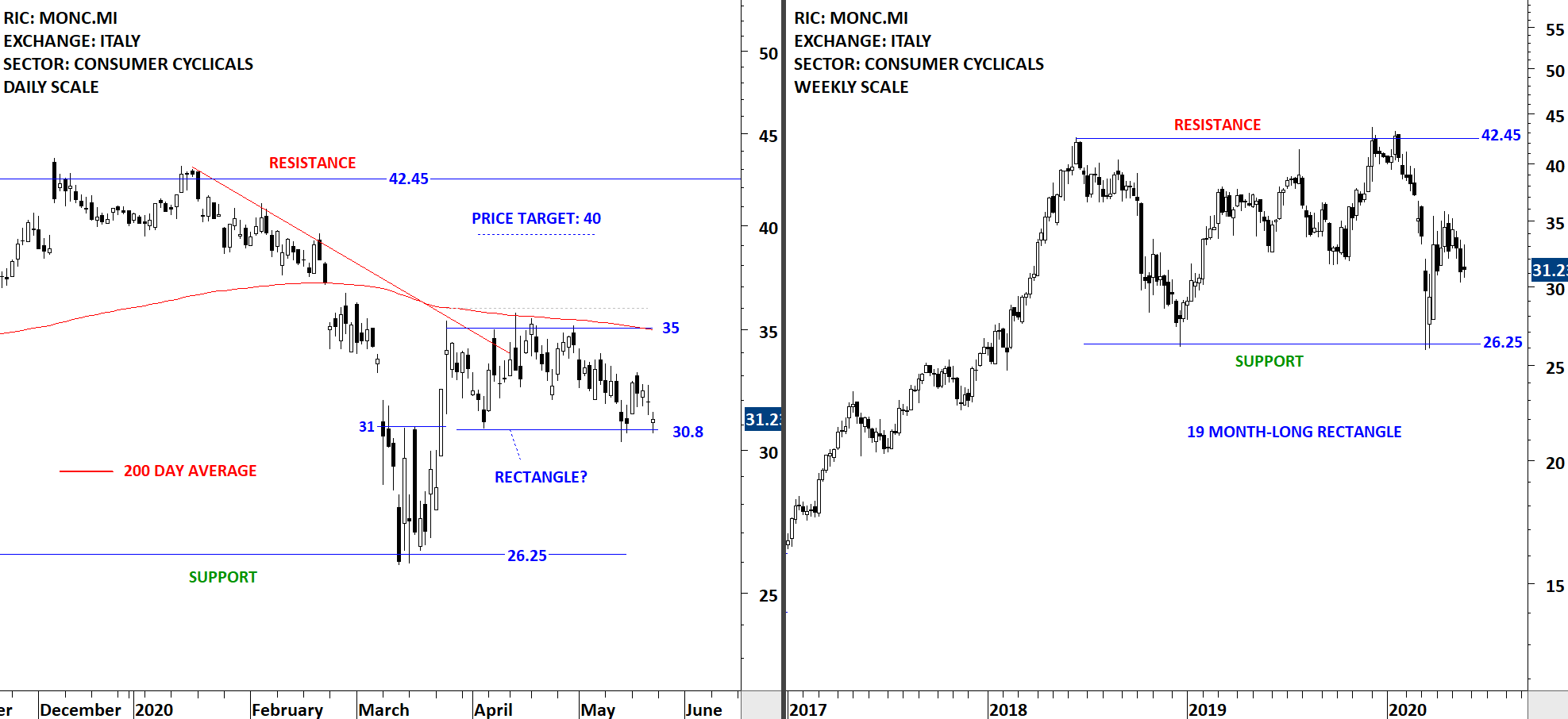 Moncler SpA is an Italy-based company engaged in fashion industry. The Company designs, produces and distributes clothing and accessories through Moncler brand. The stock is listed on the Milan Stock Exchange. Price chart formed a 19 month-long rectangle with the horizontal boundary acting as strong support at 26.25 levels. Moncler had a strong rebound from the horizontal support. Over the past month the stock formed a short-term consolidation between 30.8 and 35 levels. The short-term consolidation can be identified as rectangle. A daily close above 36 levels will confirm the breakout with the possible chart pattern price target of 40 levels. Breakdown below the support at 30.8 levels can push the stock to test long-term support at 26.25 levels. (Learn more: Support & Resistance)
