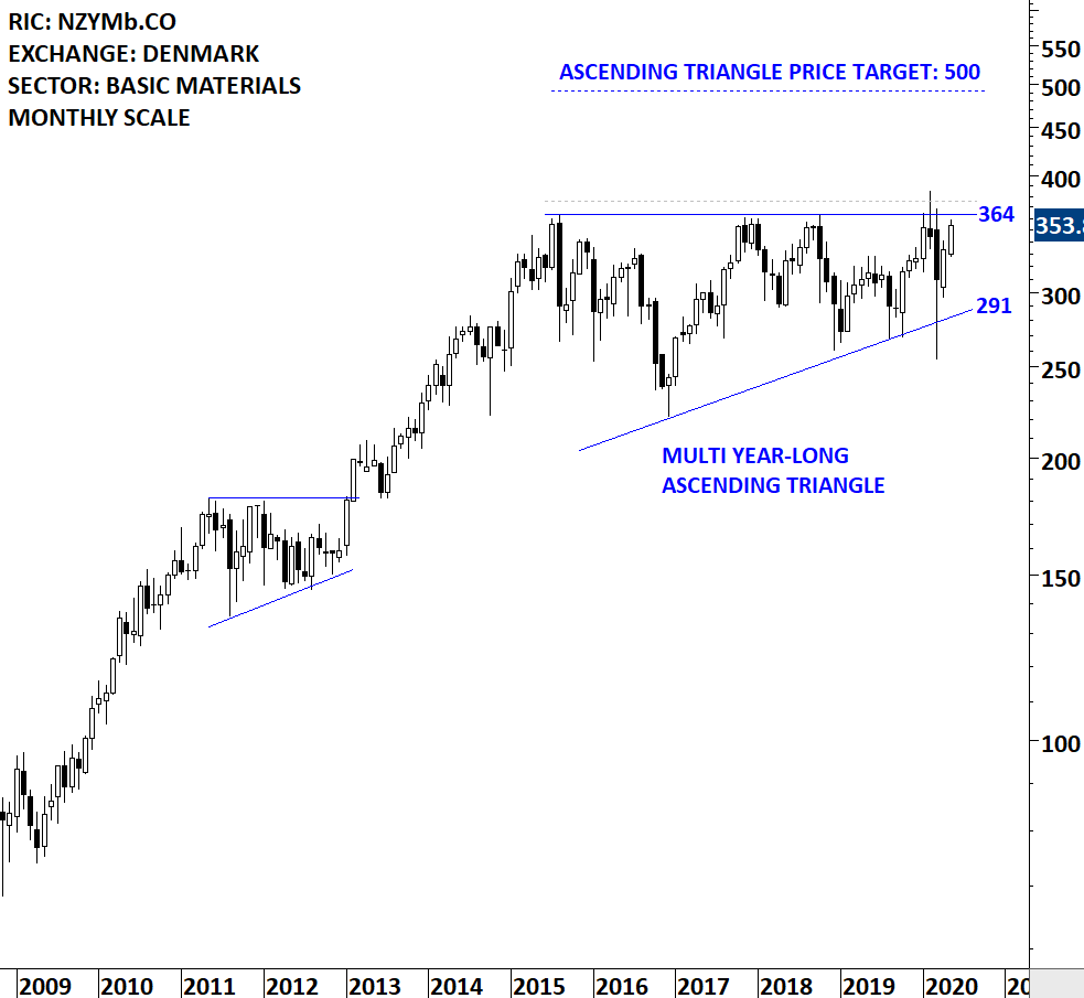 Novozymes A/S is a Denmark-based biotechnology company engaged in the production and sale of industrial enzymes, microorganisms and biopharmaceutical ingredients. The stock is listed on the Copenhagen Stock Exchange. Price chart formed a multi year-long ascending triangle with the horizontal boundary acting as strong resistance at 364.00 levels. The horizontal boundary was tested several times over the course of the chart pattern. A daily close above 375.00 levels will confirm the breakout from the multi year-long ascending triangle with the possible chart pattern price target of 500.0 levels. (Learn more: Video Tutorial)