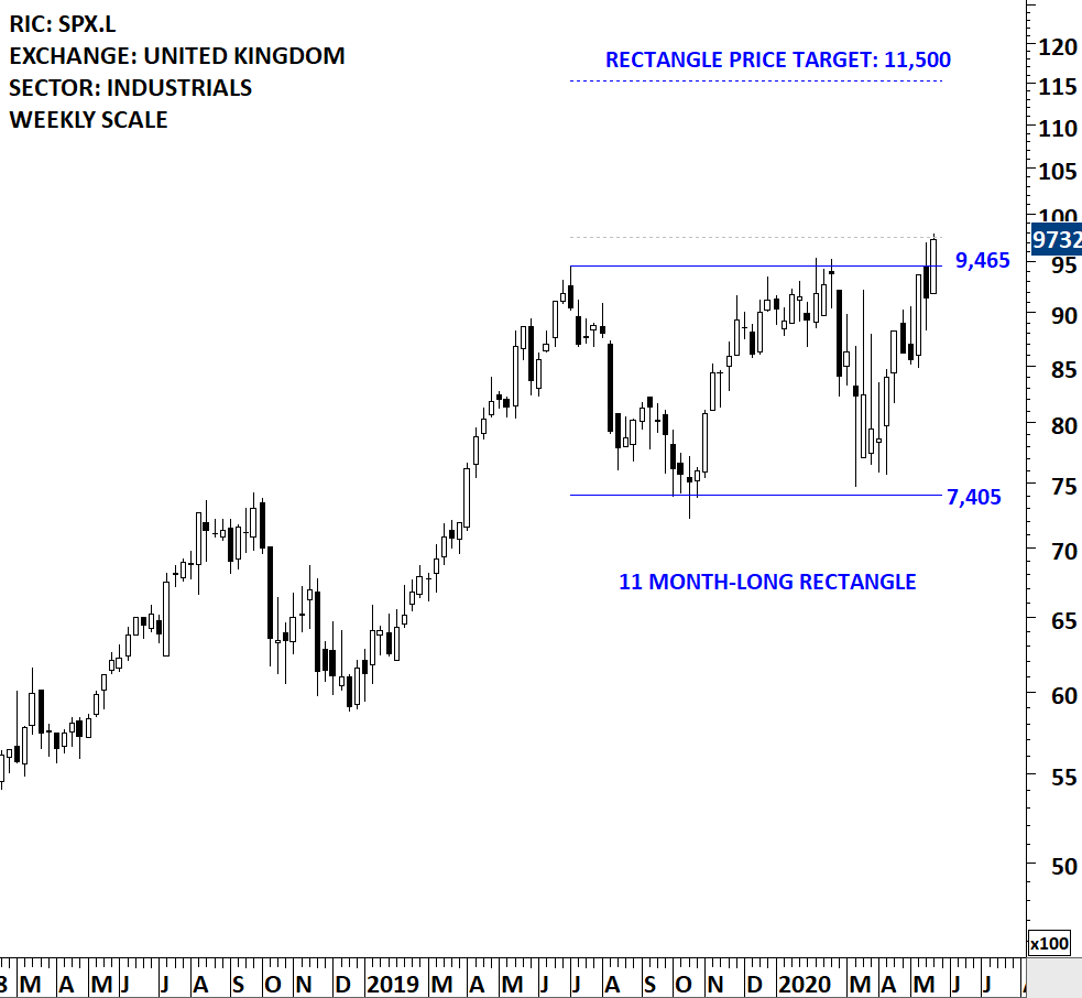 Spirax-Sarco Engineering plc is a United Kingdom-based industrial engineering company. The stock is listed on the London Stock Exchange. Price chart formed an 11 month-long rectangle with the horizontal boundary acting as strong resistance at 9,465.0 levels. The horizontal boundary was tested several times over the course of the chart pattern. A daily close above 9,750.0 levels will confirm the breakout from the 11 month-long rectangle with the possible chart pattern price target of 11,500.0 levels. This week’s price action was borderline breakout. (Learn more: Video Tutorial)