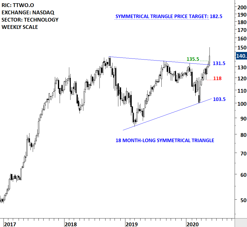 Take-Two Interactive Software, Inc. is a developer, publisher and marketer of entertainment for consumers around the world. The Company develops and publishes products through its labels, Rockstar Games and 2K. The stock is listed on the Nasdaq Stock Exchange. Price chart formed an 18 month-long symmetrical triangle with the upper boundary acting as strong resistance at 131.50 levels. The upper boundary was tested several times over the course of the chart pattern. The daily close above 135.5 levels confirmed the breakout from the 18 month-long symmetrical triangle with the possible chart pattern price target of 182.5 levels. (Learn more: Video Tutorial)