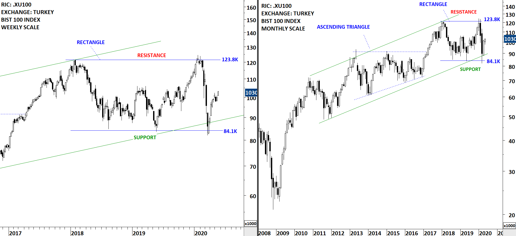 Turkey’s BIST 100 equity benchmark rebounded from the strong horizontal support at 84.1K. This was the 3rd test over the past 2 years. The monthly scale chart shows a possible trend channel. Both the lower boundary of the trend channel and the horizontal support are overlapping at the same level, making it a strong technical support. The long-term trend is upwards. Last 2 year’s consolidation is offering a wide trading range between 84.1K and 123.8K levels.