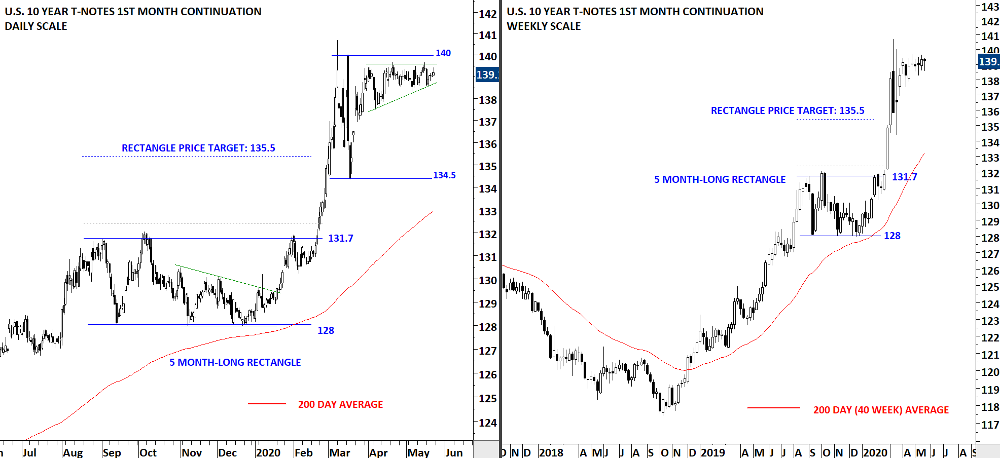 After breaking out of a 5 month-long rectangle continuation chart pattern, U.S. 10 Year T-Notes had a strong rally. Flight to safety (risk off) trade resulted in a rush to government bonds. Price tested the same levels for the 3rd time and reversed. Resistance stands around 140 levels. Failure to move higher can result in a trading range between 140.5 and 134.5 levels. Last 2 month’s price action can be identified as a possible ascending triangle (green boundaries). Ascending triangle has a bullish bias but we need to see a breakout as a confirmation of strength.