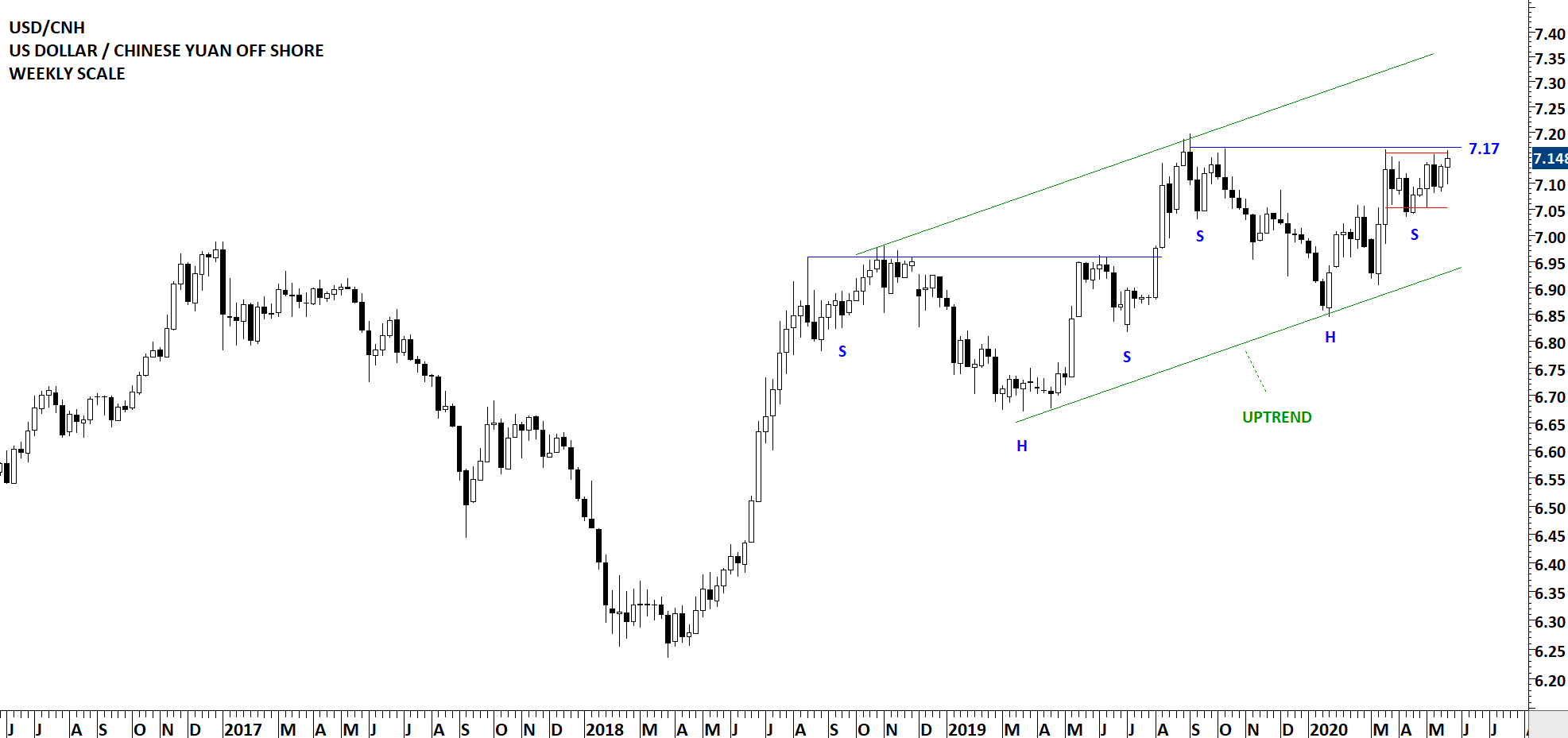 The offshore Chinese yuan can devalue further if we see a breakout above 7.17 levels. I can identify 2 different H&S continuation chart patterns in the steady uptrend. The second one (most recent chart pattern development) has a horizontal boundary at 7.17 levels. Breakout can push the price towards 7.35-7.40 area.