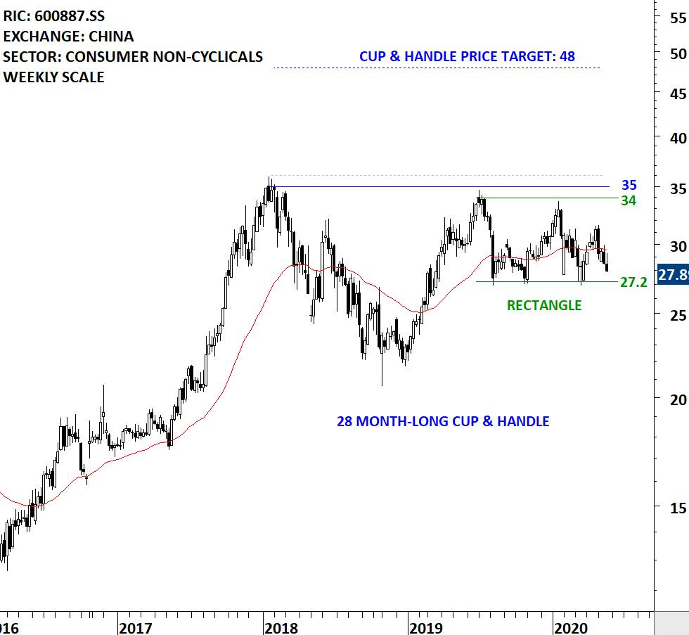 INNER MONGOLIA YILI INDUSTRIAL GROUP CO., LTD. is a China-based company, principally engaged in the processing, production and distribution of dairy products and mixed feedstuffs. The stock is listed on the Shanghai Stock Exchange. Price chart formed a 28 month-long cup & handle continuation with the horizontal boundary acting as strong resistance at 35.00 levels. The horizontal boundary was tested several times over the course of the chart pattern. The handle part of the cup & handle chart pattern can be identified as a rectangle. A daily close above 36.0 levels will confirm the breakout from the 28 month-long cup & handle continuation with the possible chart pattern price target of 48.0 levels. (Learn more: Video Tutorial)