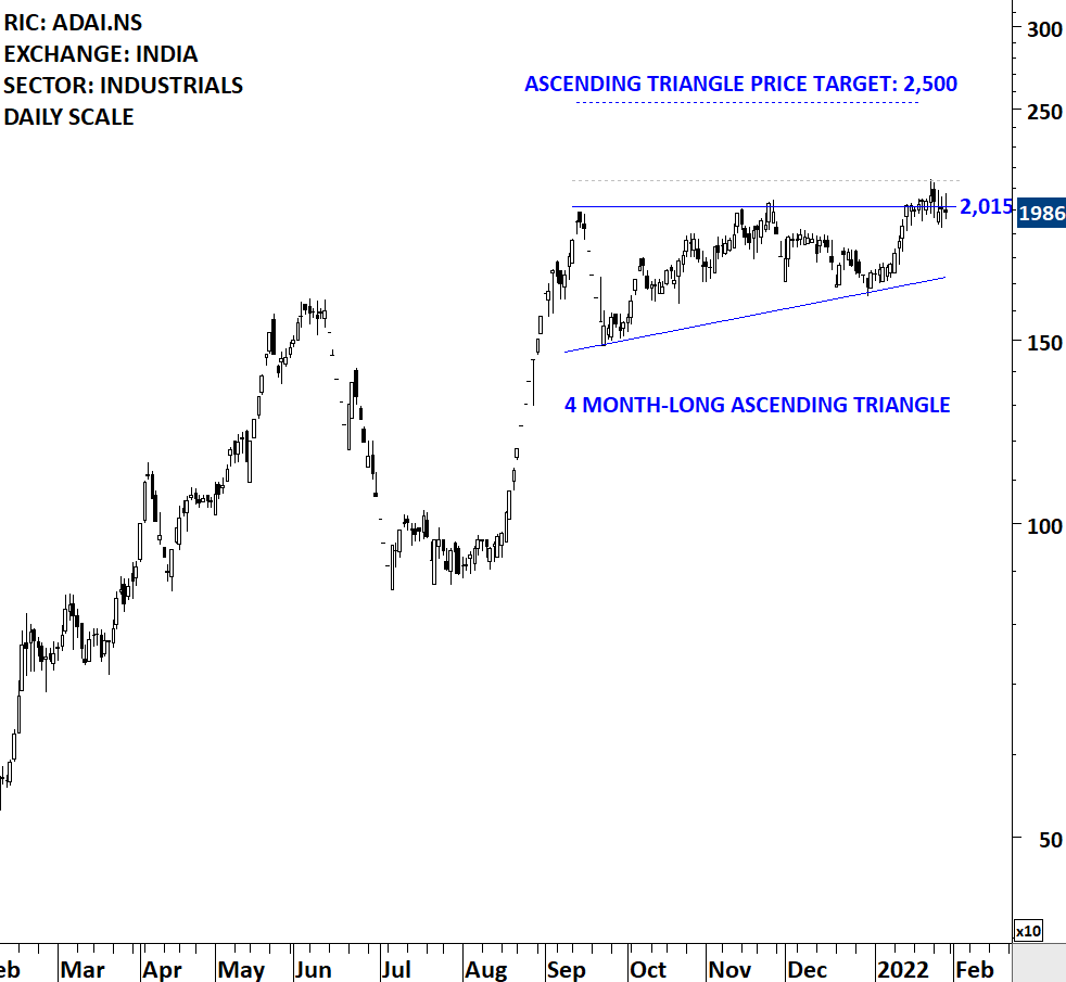 Adani Transmission Limited is a holding company. The Company operates as a power transmission company. It is engaged in transmission of electric energy and trading of castor oil. The stock is listed on the National Stock Exchange of India. Price chart formed a 4 month-long ascending triangle with the horizontal boundary acting as strong resistance at 2,015.00 levels. The horizontal boundary was tested several times over the course of the chart pattern. A daily close above 2,137.00 levels will confirm the breakout from the 4 month-long ascending triangle with the possible chart pattern price target of 2,500.00 levels. The stock is not very liquid for large portfolios. (Learn more: Video Tutorial)