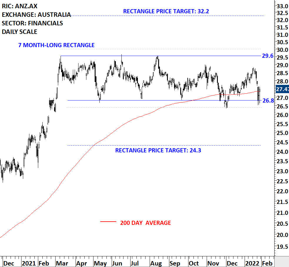 Australia and New Zealand Banking Group Limited provides a range of banking and financial products and services. The Company’s segments include Australia, New Zealand, Institutional, Pacific, and Technology, Services and Operations and Group Centre (TSO). The stock is listed on the Australia Stock Exchange. Price chart formed a 7 month-long rectangle with the horizontal boundary acting as strong resistance at 29.60 levels. The horizontal boundary was tested several times over the course of the chart pattern. A daily close above 30.00 levels will confirm the breakout from the 7 month-long rectangle with the possible chart pattern price target of 32.20 levels. A daily close below 26.4 levels will confirm the breakdown with the possible price target of 24.3 levels. (Learn more: Video Tutorial)