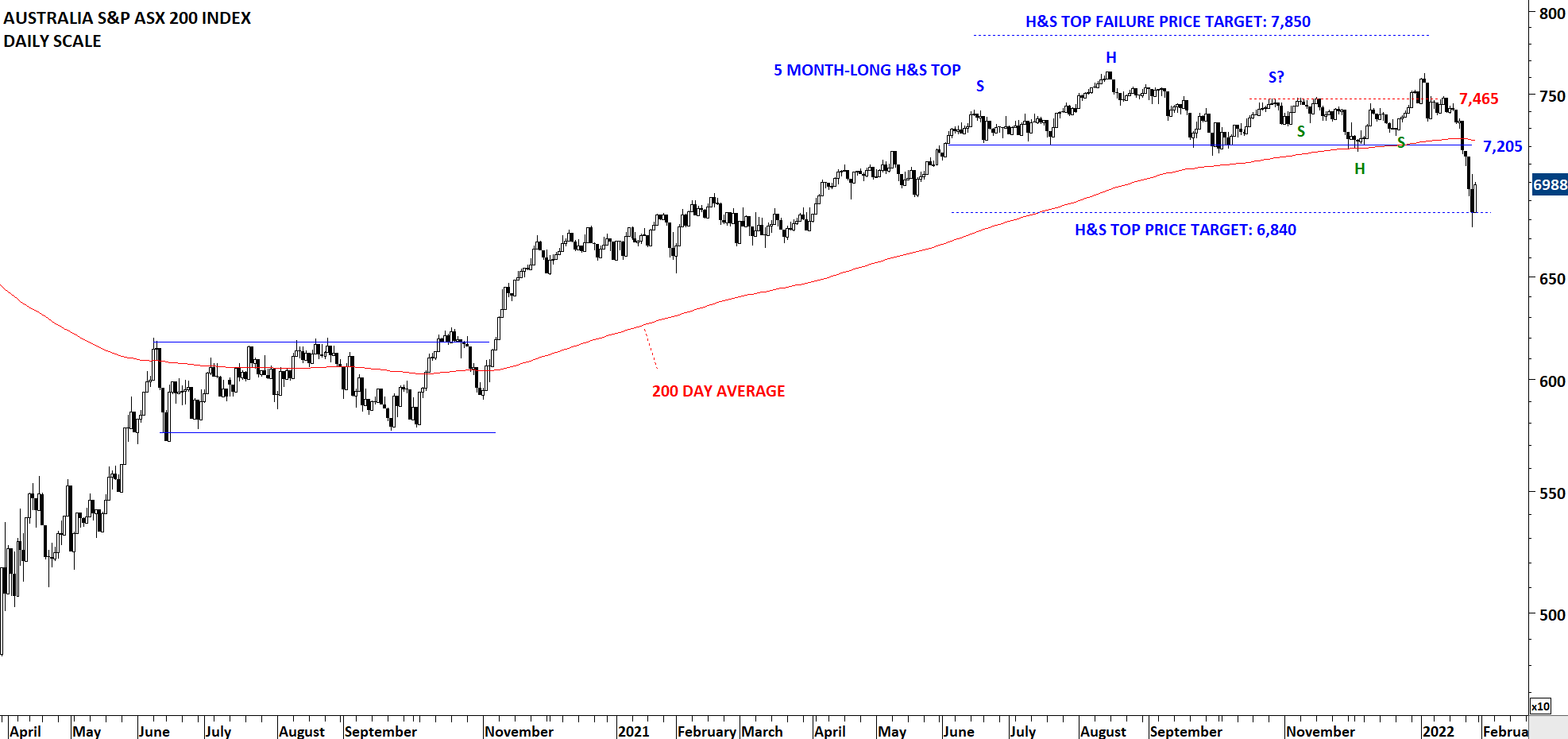 Australia S&P ASX 200 Index completed the 5 month-long H&S top and reached its price target. The index is now below the long-term average and in a downtrend.