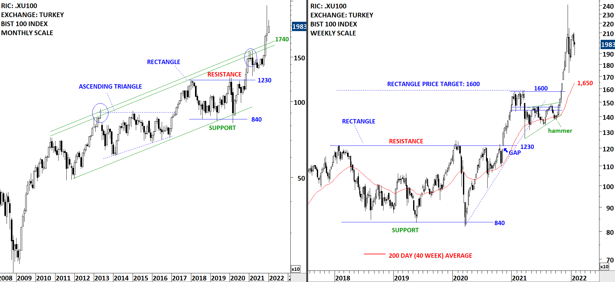 Turkey’s BIST 100 equity benchmark cleared the resistance at 1,600 levels on weekly scale. Breakout above a rising trend channel (monthly scale) is usually followed by a runaway price action (strong rally). The monthly close for November and December were above the upper boundary of the trend channel. The upper boundary of the monthly scale price chart is at 1,740 levels that is expected to be support during pullbacks. The daily scale price chart shows a blow off top with the long upper shadow. I expect the index to consolidate and possibly pullback to the upper boundary of the rising trend channel.