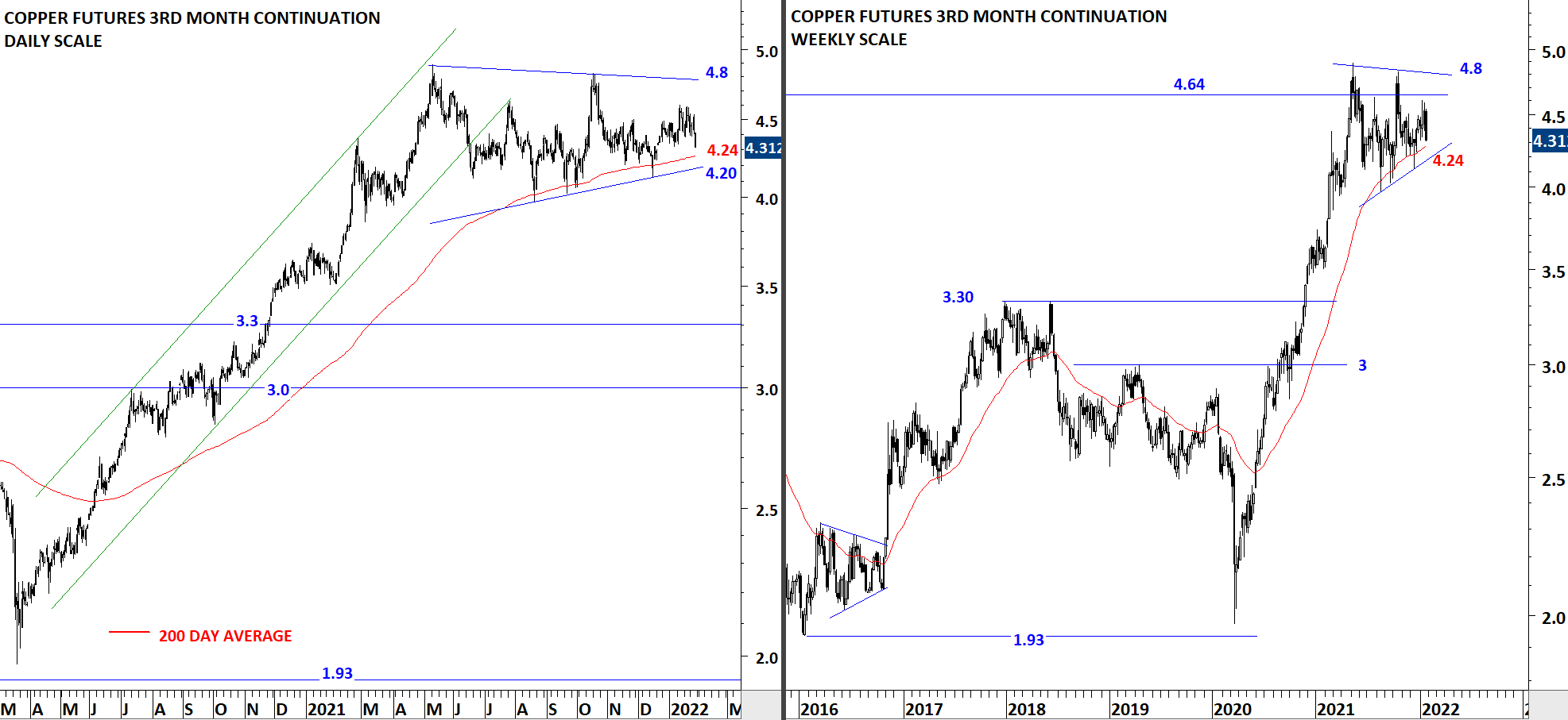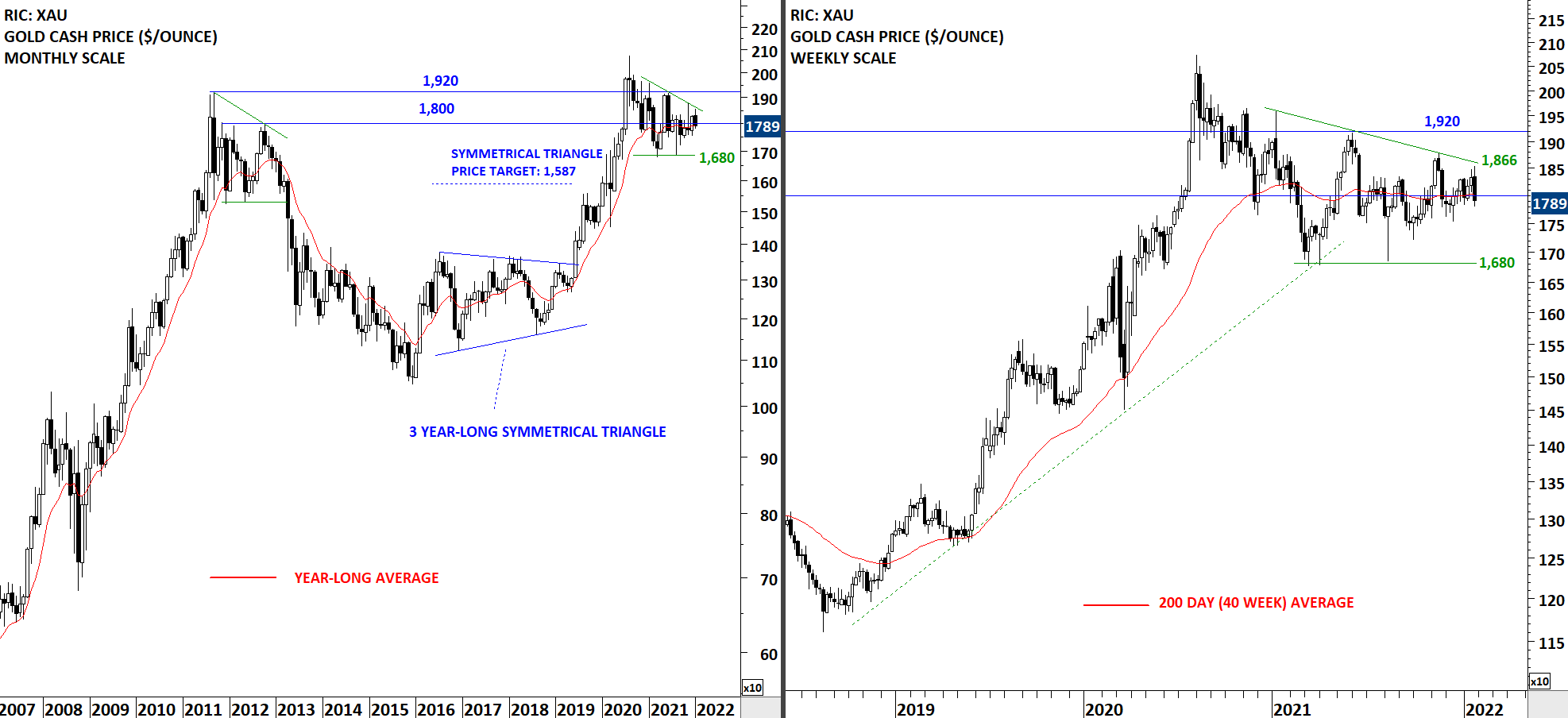 Price chart of cash Gold price has been forming lower highs since the last quarter of 2020. Price is trading around the 200-day average at 1,800 levels. The chart pattern on monthly scale can become a descending triangle with the horizontal support at 1,680 levels. Another test of 1,680 levels can put the long-term uptrend in jeopardy. I’ve adjusted the upper boundary of the possible descending triangle. The resistance stands at 1,866 levels. Breakout above 1,866 levels will negate the descending triangle.