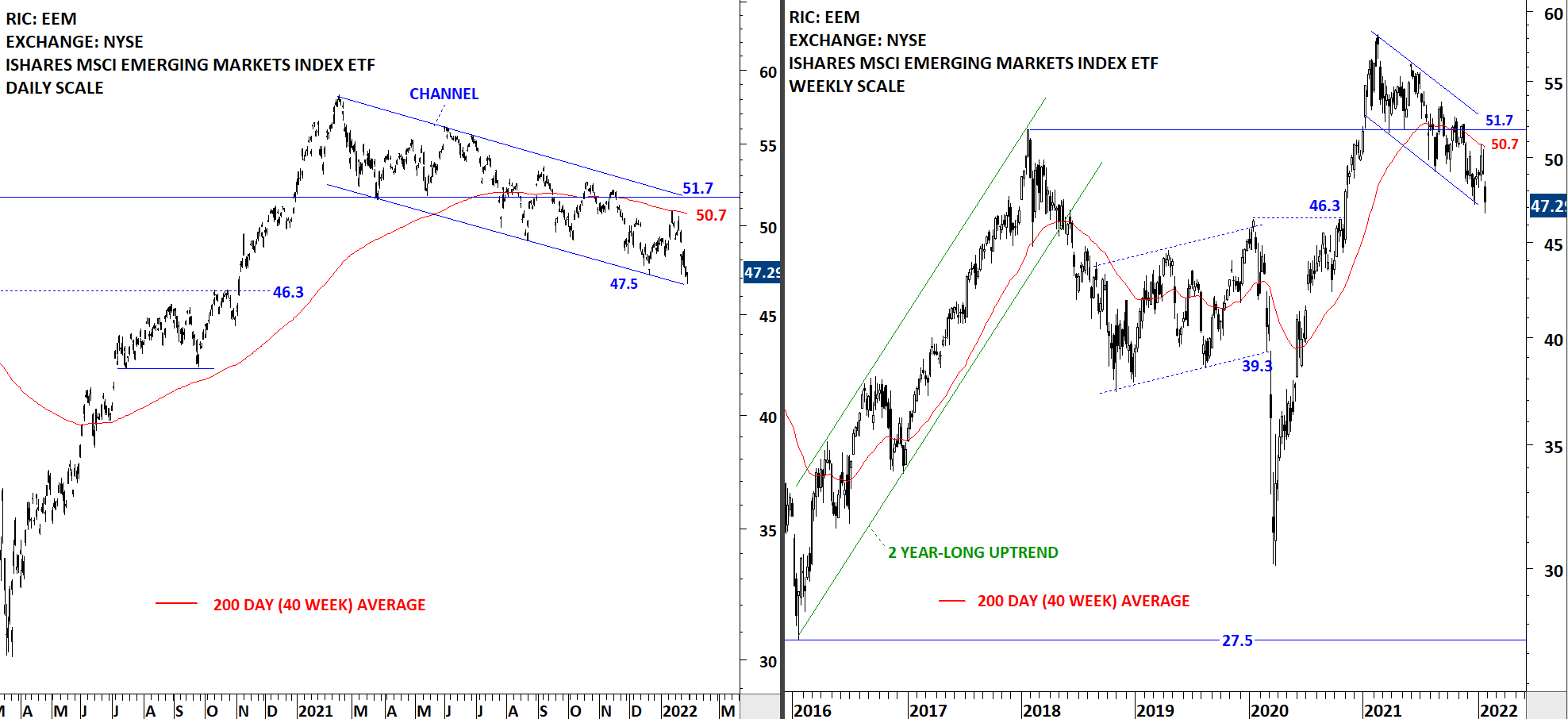 The benchmark for the Emerging Markets performance, the iShares MSCI Emerging Markets Index ETF (EEM) is trading below the 200-day average. The ETF has been recording lower lows and lower highs confirming the downtrend in Emerging Markets. The ETF is once again testing the lower boundary of the downward sloping channel. Strong resistance area remains between 50.7 and 51.7. The longer price remains below the 200-day average, the higher the chances of an established downtrend. There is no bottom reversal chart pattern on daily scale. Breakout above resistance area between 50.7 and 51.7 can reverse the past one year’s downtrend. Breakdown below the lower boundary of the trend channel can accelerate the downtrend.