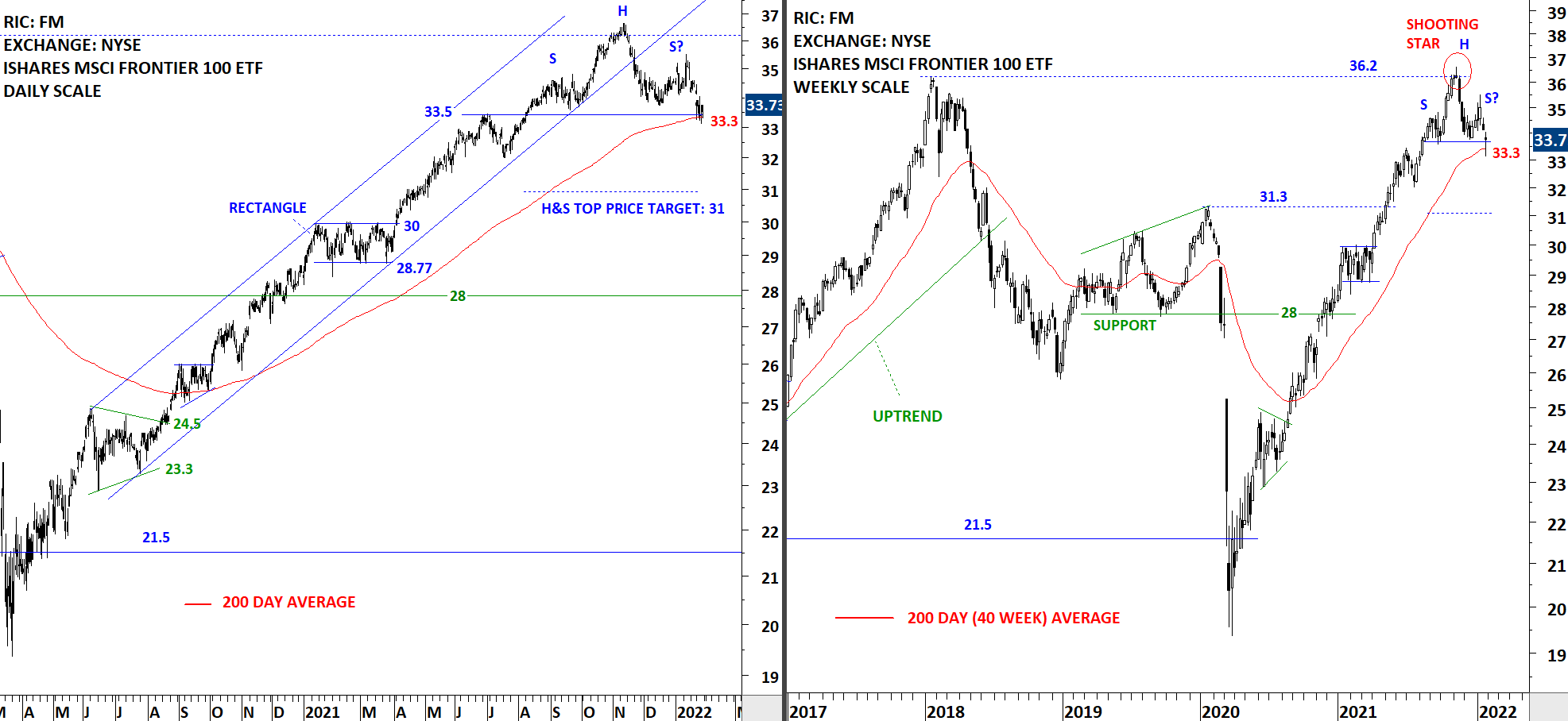 The benchmark for the Frontier equity markets performance, the iShares MSCI Frontier 100 ETF, possibly completed the right shoulder of the H&S top. The 200-day (40 week) average is forming support at 33.3 levels. Support area remains between 33.3 and 33.5 levels. Breakdown below support at 33.3 levels can target 31 levels. Frontier Markets ETF is one of the last (between ACWI, EEM and FM) that is still holding above its year-long average.