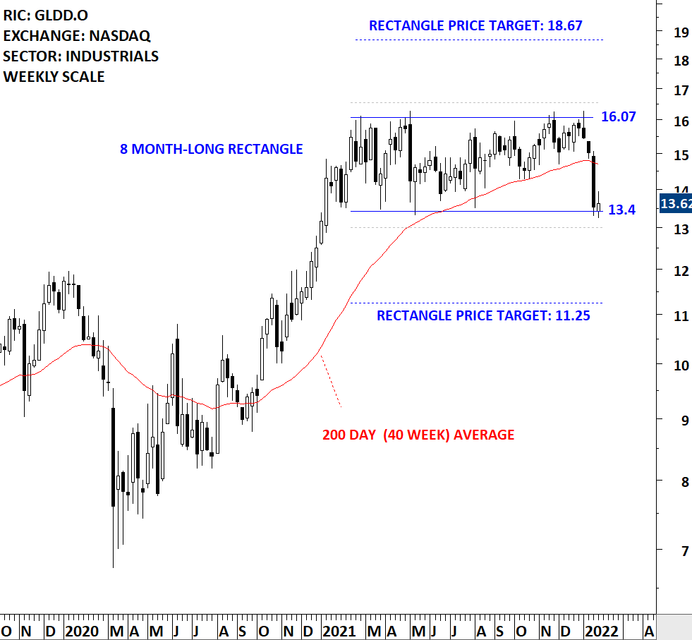 Great Lakes Dredge & Dock Corporation (Great Lakes) is a provider of dredging services. The Company provides dredging services in the East, West and Gulf Coasts of the United States and around the world. The stock is listed on the Nasdaq Stock Exchange. Price chart formed an 8 month-long rectangle with the horizontal boundary acting as strong resistance at 16.07 levels. The horizontal boundary was tested several times over the course of the chart pattern. A daily close above 16.55 levels will confirm the breakout from the 8 month-long rectangle with the possible chart pattern price target of 18.67 levels. Until there is a breakout, rectangle offers trading opportunity between the boundaries. A daily close below 13 levels can confirm the rectangle as a top reversal and target 11.25 levels. (Learn more: Video Tutorial)