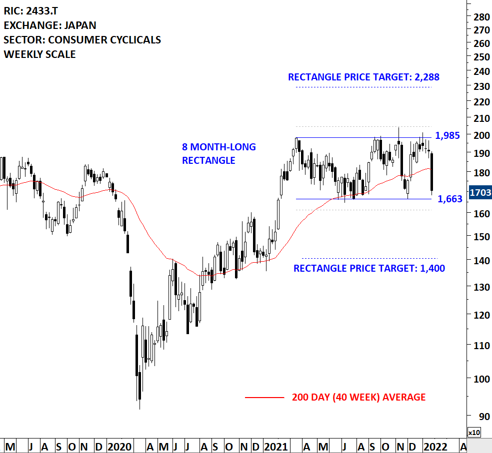 HAKUHODO DY HOLDINGS INCORPORATED is a Japan-based advertising holding company that is mainly engaged in the provision of marketing solution as a marketing service company. The stock is listed on the Tokyo Stock Exchange. Price chart formed an 8 month-long rectangle with the horizontal boundary acting as strong resistance at 1,985.00 levels. The horizontal boundary was tested several times over the course of the chart pattern. A daily close above 2,045.00 levels will confirm the breakout from the 8 month-long rectangle with the possible chart pattern price target of 2,288.00 levels. A daily close below 1,613 levels will confirm the breakdown with the price target of 1,400 levels. (Learn more: Video Tutorial)