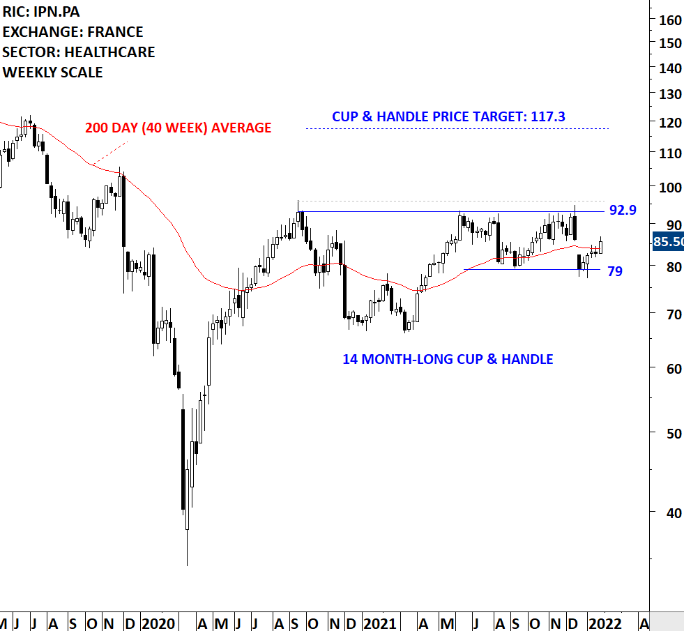 Ipsen SA is a France-based biopharmaceutical group specialized in specialty care. The Company operates globally through two segments: Specialty Care and Consumer Healthcare. The stock is listed on the Paris Stock Exchange. Price chart formed a 14 month-long cup & handle continuation with the horizontal boundary acting as strong resistance at 92.90 levels. The horizontal boundary was tested several times over the course of the chart pattern. A daily close above 95.70 levels will confirm the breakout from the 14 month-long cup & handle continuation with the possible chart pattern price target of 117.30 levels. The handle part of the pattern is possibly morphing into a rectangle. (Learn more: Video Tutorial)