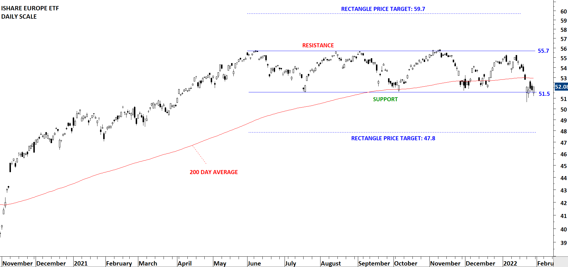 ISHARE EUROPE ETF (IEV) formed a 6 month-long rectangle with the lower boundary acting as support at 51.5 and the upper boundary as resistance at 55.7 levels. Breakdown below the well-defined lower boundary can push the index towards the price target at 47.8 levels.