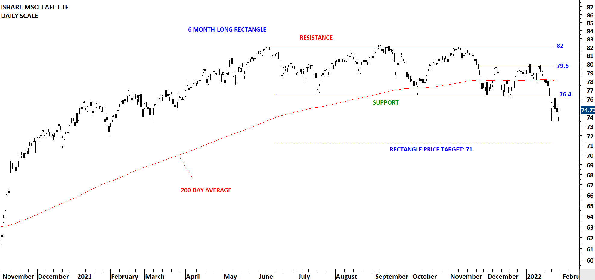 ISHARE MSCI EAFE ETF (EFA) formed a 6 month-long rectangle with the upper boundary acting as resistance at 82 and the lower boundary as support at 76.4 levels. Breakdown below the horizontal support resulted in a top reversal with the price target at 71 levels. Price is below the 200-day average.
