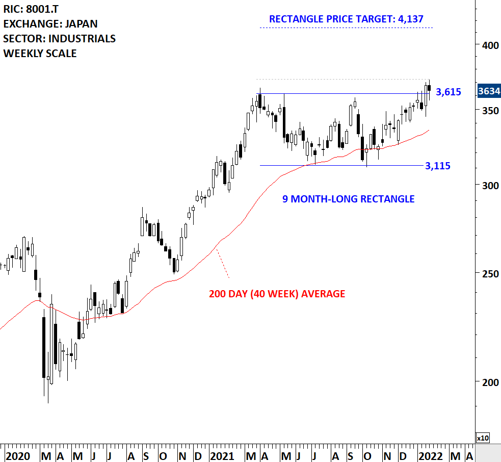 ITOCHU Corporation is a Japan-based trading company. The stock is listed on the Tokyo Stock Exchange. Price chart formed a 9 month-long rectangle with the horizontal boundary acting as strong resistance at 3,615.00 levels. The horizontal boundary was tested several times over the course of the chart pattern. A daily close above 3,723.00 levels will confirm the breakout from the 9 month-long rectangle with the possible chart pattern price target of 4,137.00 levels. Breakout can push the stock to all-time highs. (Learn more: Video Tutorial)