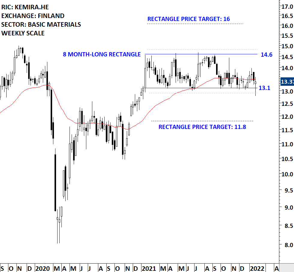 Kemira Oyj is a Finland-based Company, which offers sustainable chemical solutions for water intensive industries. The stock is listed on the Helsinki Stock Exchange. Price chart formed an 8 month-long rectangle with the horizontal boundary acting as strong resistance at 14.60 levels. The horizontal boundary was tested several times over the course of the chart pattern. A daily close above 14.80 levels will confirm the breakout from the 8 month-long rectangle with the possible chart pattern price target of 16.00 levels. The stock offers trading opportunity between boundaries. Incase of a daily close below 12.90 levels rectangle can act as a top reversal and target 11.8 levels. (Learn more: Video Tutorial)
