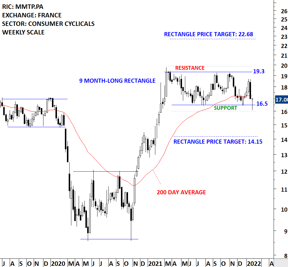 Metropole Television SA is a France-based audiovisual company that specializes in the production, distribution and marketing of television (TV) programs. The stock is listed on the Paris Stock Exchange. Price chart formed a 9 month-long rectangle with the horizontal boundary acting as strong support at 16.50 levels. Both boundaries were tested several times over the course of the chart pattern. A daily close above 19.9 levels will confirm the breakout from the 9 month-long rectangle with the possible chart pattern price target of 22.68 levels. Until there is a breakout in one direction the stock offers trading opportunity. A daily close below 16.15 will confirm the rectangle as a reversal with the price objective at 14.15 levels. (Learn more: Video Tutorial)