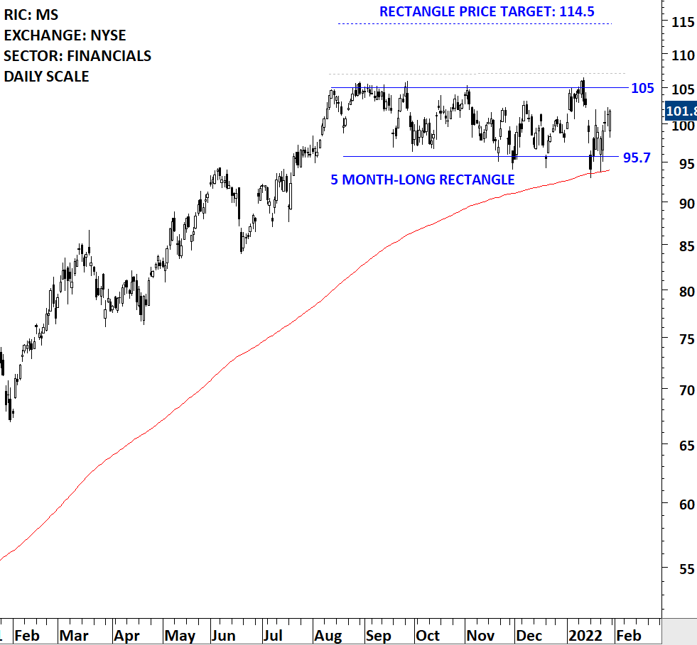 Morgan Stanley offers financial services. Through its subsidiaries, it provides a variety of products and services to a group of clients and customers, including corporations, governments, financial institutions and individuals. The stock is listed on the New York Stock Exchange. Price chart formed a 5 month-long rectangle with the horizontal boundary acting as strong resistance at 105.00 levels. The horizontal boundary was tested several times over the course of the chart pattern. A daily close above 107.00 levels will confirm the breakout from the 5 month-long rectangle with the possible chart pattern price target of 114.50 levels. For now the stock offers trading opportunity between the boundaries. (Learn more: Video Tutorial)