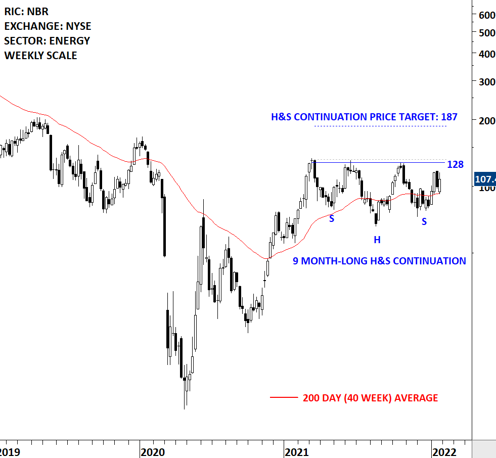 Nabors Industries Ltd. owns and operates a land-based drilling rig fleet. The Company is a provider of offshore platform drilling rigs in the United States and multiple international markets. The stock is listed on the New York Stock Exchange. Price chart formed a 9 month-long head and shoulder continuation with the horizontal boundary acting as strong resistance at 128.00 levels. The horizontal boundary was tested several times over the course of the chart pattern. A daily close above 132.00 levels will confirm the breakout from the 9 month-long head and shoulder continuation with the possible chart pattern price target of 187.00 levels. (Learn more: Video Tutorial)