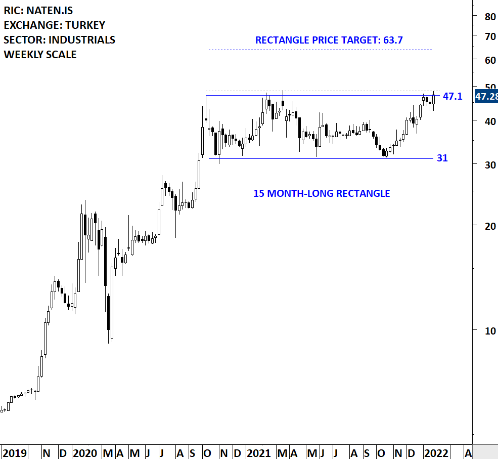 Naturel Yenilenebilir Enerji Ticaret AS is a Turkey-based company engaged in the renewable energy sector. The stock is listed on the Istanbul Stock Exchange. Price chart formed a 15 month-long rectangle with the horizontal boundary acting as strong resistance at 47.10 levels. The horizontal boundary was tested several times over the course of the chart pattern. A daily close above 48.50 levels will confirm the breakout from the 15 month-long rectangle with the possible chart pattern price target of 63.70 levels. Breakout can push the stock to all-time highs. Until there is a breakout confirmation, the stock offers trading opportunity between the boundaries. (Learn more: Video Tutorial)