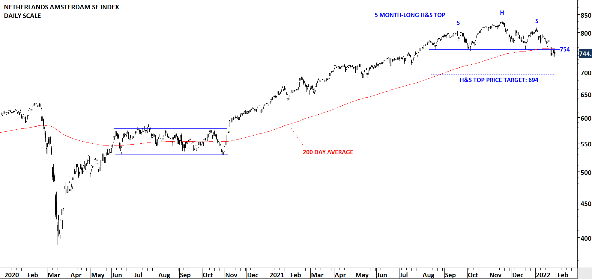 Another clean H&S top reversal can be identified on Netherlands AEX Index. 5 month-long H&S top has a neckline at 754 levels. This week’s price action breached the neckline and the 200-day average. Price target stands at 694 levels. Both the 200-day average and neckline will act as resistance.
