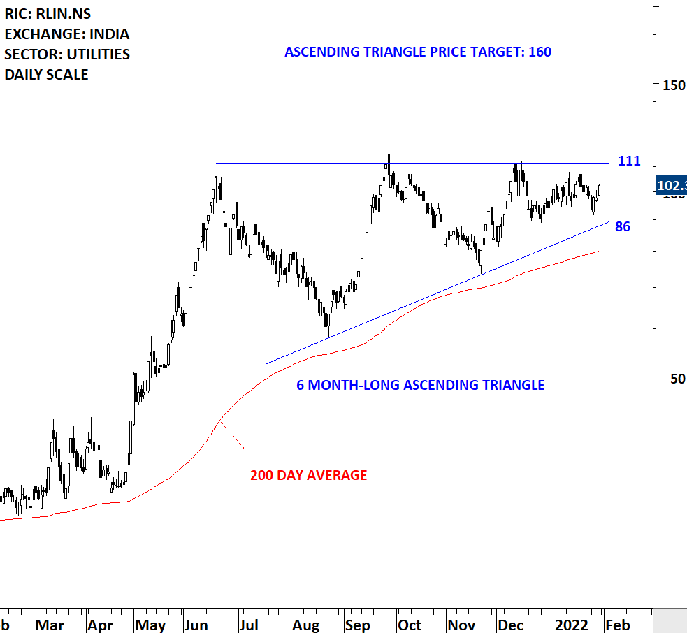 Reliance Infrastructure Limited (RInfra) is involved in the infrastructure sector. The Company is a utility company with presence across the chain of power businesses, such as generation, transmission, distribution and power trading. The stock is listed on the National Stock Exchange of India. Price chart formed a 6 month-long ascending triangle with the horizontal boundary acting as strong resistance at 111.00 levels. The horizontal boundary was tested several times over the course of the chart pattern. A daily close above 114.00 levels will confirm the breakout from the 6 month-long ascending triangle with the possible chart pattern price target of 160.00 levels. (Learn more: Video Tutorial)