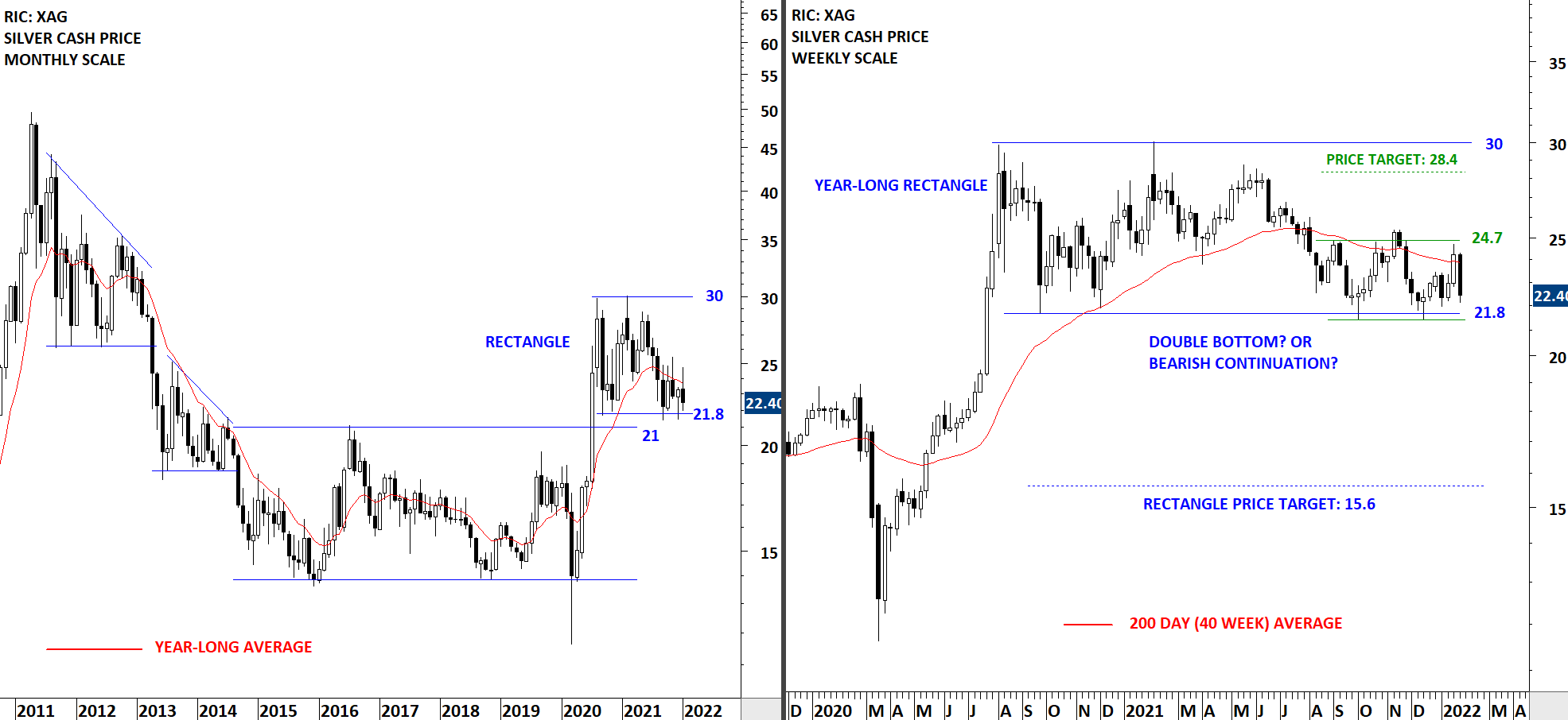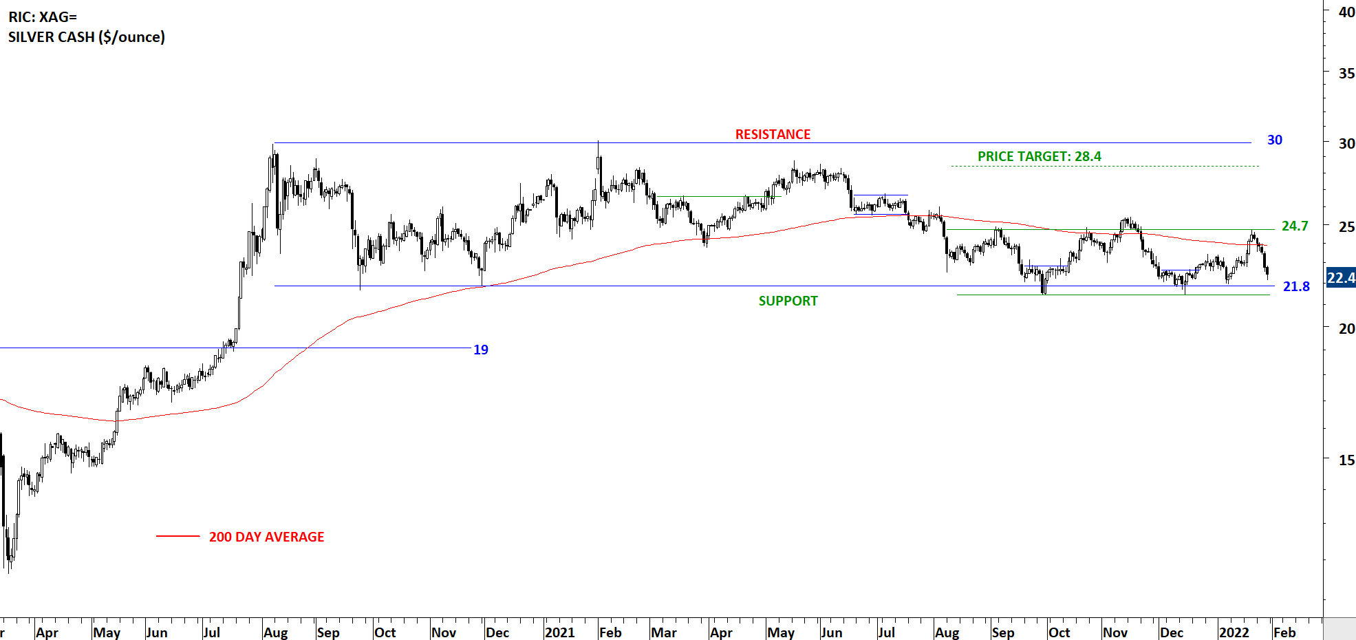 Silver remains range bound between 21.8 and 30 levels. There is also another short-term consolidation range between 21.8 and 24.7 levels. I’m weighing the possibility of a double bottom with the neckline standing at 24.7 levels. Failure to recover above the year-long average and target 24.7 levels can increase the likelihood of the latest consolidation becoming a bearish continuation. In that case I will closely monitor horizontal support at 21.8 levels.
