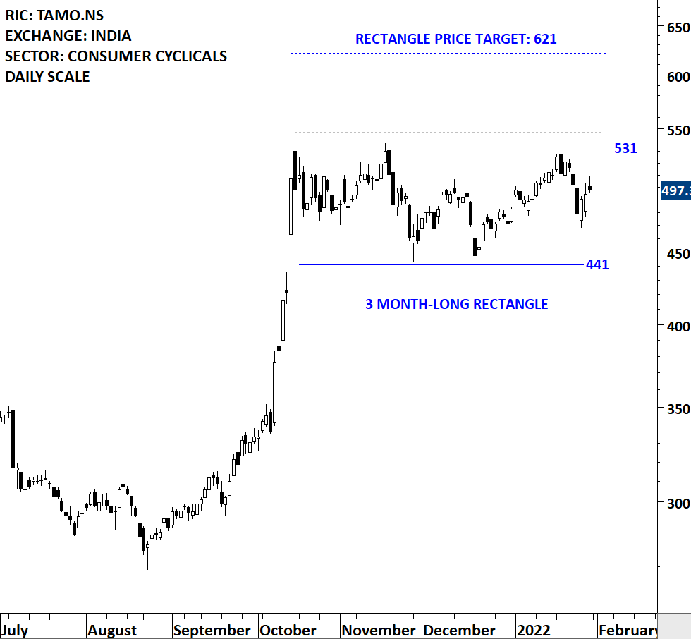 Tata Motors Limited is an automobile company. The Company is engaged in manufacture of motor vehicles. The Company’s segments include automotive operations and all other operations. The stock is listed on the National Stock Exchange. Price chart formed a 3 month-long rectangle with the horizontal boundary acting as strong resistance at 531.00 levels. The horizontal boundary was tested several times over the course of the chart pattern. A daily close above 547.00 levels will confirm the breakout from the 3 month-long rectangle with the possible chart pattern price target of 621.00 levels. (Learn more: Video Tutorial)