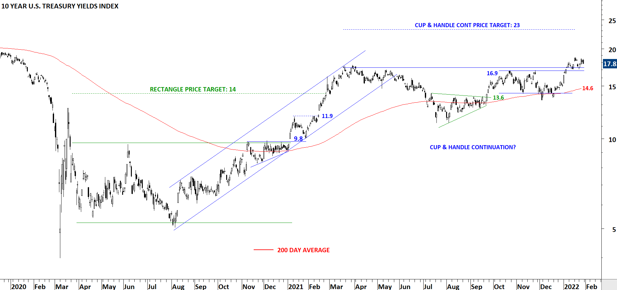 The chart below is the 10 Year U.S. Treasury Yield Index. Yields possibly completed a multi-month long cup & handle continuation with the horizontal boundary that was acting as resistance at 17 levels. I am now monitoring this chart as a completed cup & handle with the price target of 23 levels. 16.9 becomes the new support.