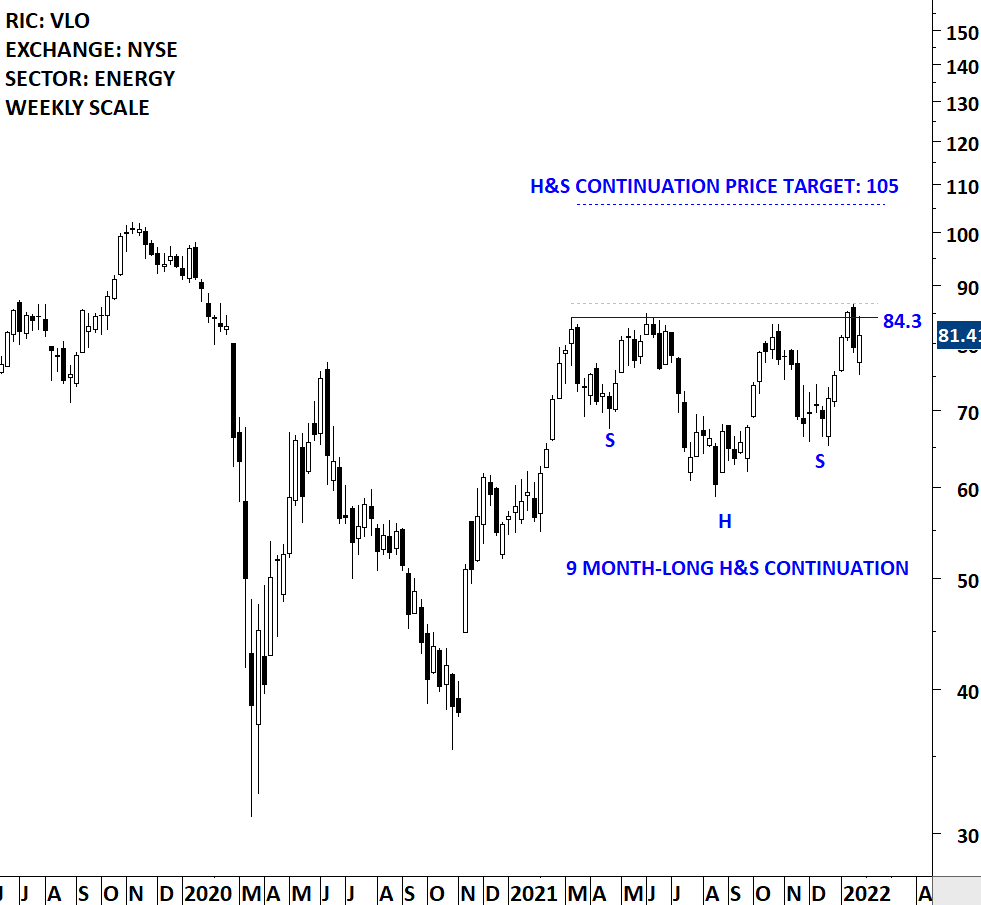 Valero Energy Corporation (Valero) is an is an international manufacturer and marketer of transportation fuels and petrochemical products. The Company’s segments include refining, renewable diesel, and ethanol. The stock is listed on the New York Stock Exchange. Price chart formed a 9 month-long head and shoulder continuation with the horizontal boundary acting as strong resistance at 84.30 levels. The horizontal boundary was tested several times over the course of the chart pattern. A daily close above 86.80 levels will confirm the breakout from the 9 month-long head and shoulder continuation with the possible chart pattern price target of 105.00 levels. (Learn more: Video Tutorial)