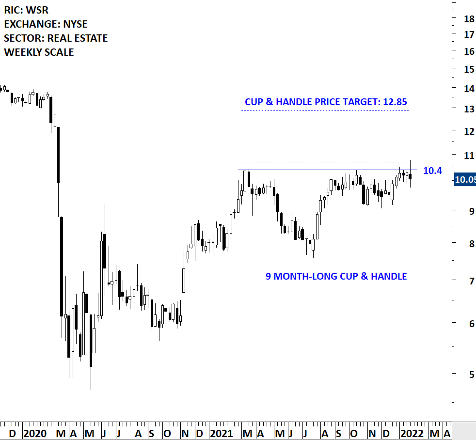 Whitestone REIT is a real estate investment trust, which is engaged in owning and operating commercial properties in culturally diverse markets in the metropolitan areas. The Company’s acquisition targets are located in densely populated, culturally diverse neighborhoods, primarily in and around Austin, Chicago, Dallas-Fort Worth, Houston, Phoenix and San Antonio. The stock is listed on the New York Stock Exchange. Price chart formed a 9 month-long cup & handle continuation with the horizontal boundary acting as strong resistance at 10.40 levels. The horizontal boundary was tested several times over the course of the chart pattern. A daily close above 10.70 levels will confirm the breakout from the 9 month-long cup & handle continuation with the possible chart pattern price target of 12.85 levels. (Learn more: Video Tutorial)