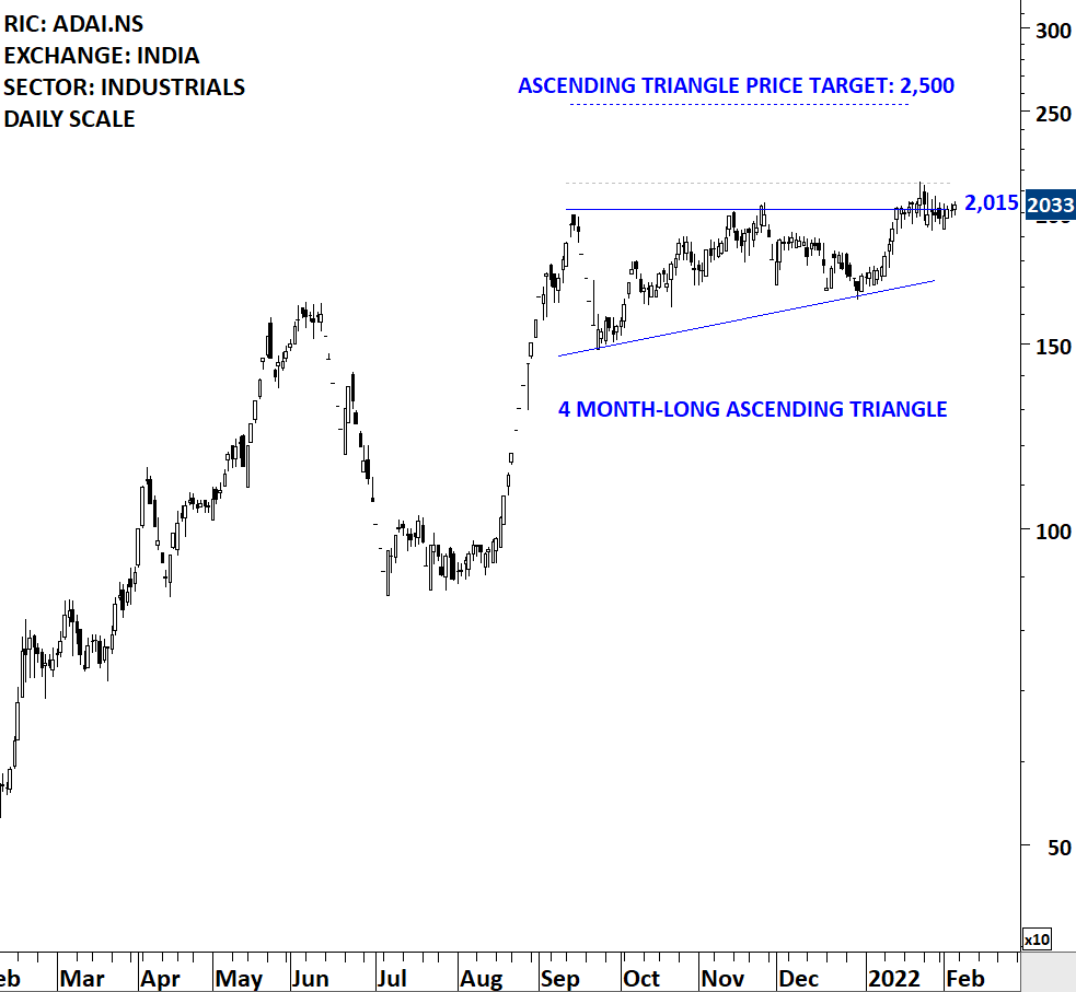 Adani Transmission Limited is a holding company. The Company operates as a power transmission company. It is engaged in transmission of electric energy and trading of castor oil. The stock is listed on the National Stock Exchange of India. Price chart formed a 4 month-long ascending triangle with the horizontal boundary acting as strong resistance at 2,015.00 levels. The horizontal boundary was tested several times over the course of the chart pattern. A daily close above 2,137.00 levels will confirm the breakout from the 4 month-long ascending triangle with the possible chart pattern price target of 2,500.00 levels. The stock is not very liquid for large portfolios. (Learn more: Video Tutorial)