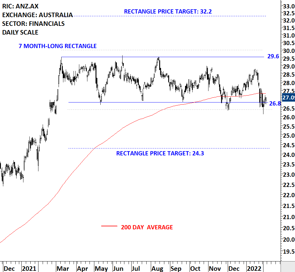 Australia and New Zealand Banking Group Limited provides a range of banking and financial products and services. The Company’s segments include Australia, New Zealand, Institutional, Pacific, and Technology, Services and Operations and Group Centre (TSO). The stock is listed on the Australia Stock Exchange. Price chart formed a 7 month-long rectangle with the horizontal boundary acting as strong resistance at 29.60 levels. The horizontal boundary was tested several times over the course of the chart pattern. A daily close above 30.00 levels will confirm the breakout from the 7 month-long rectangle with the possible chart pattern price target of 32.20 levels. A daily close below 26.4 levels will confirm the breakdown with the possible price target of 24.3 levels. (Learn more: Video Tutorial)