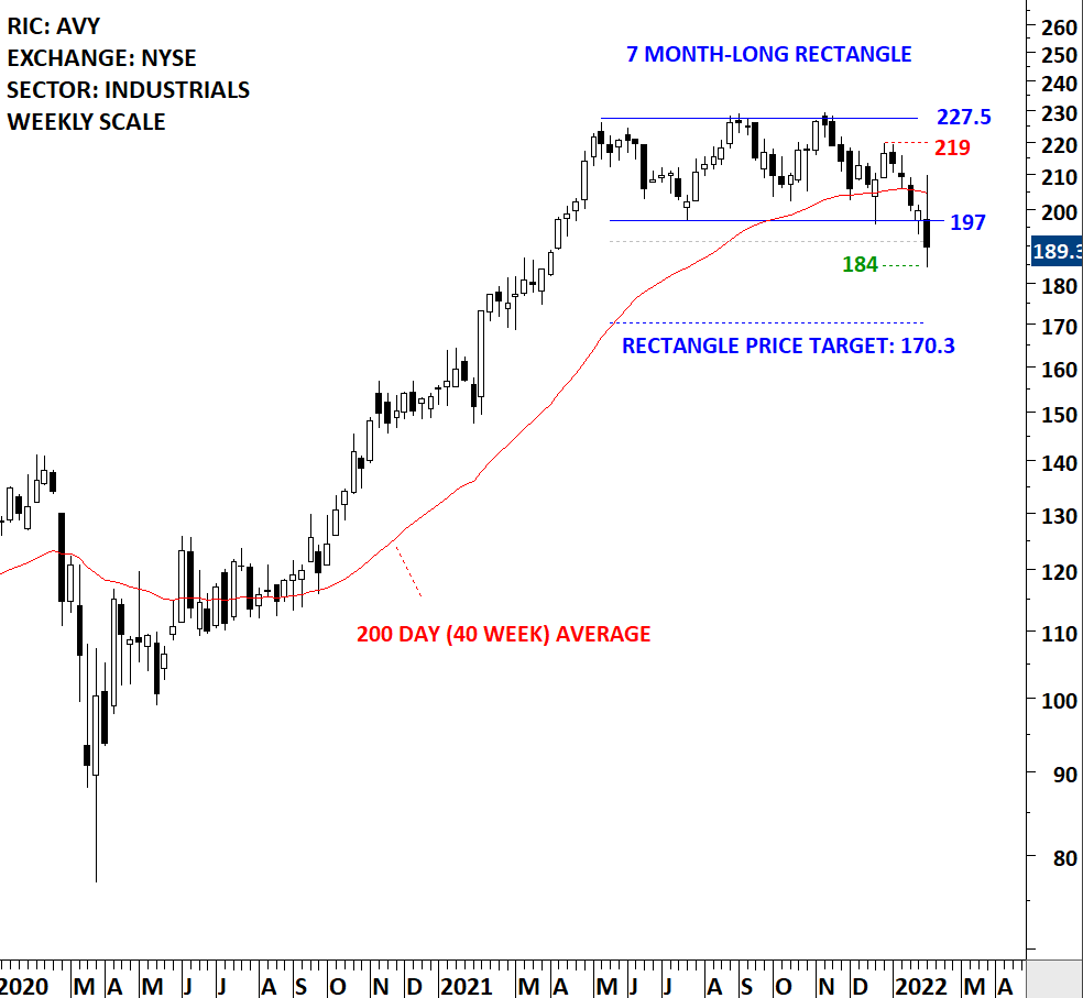 Avery Dennison Corporation is engaged in the production of pressure-sensitive materials and a range of tickets, tags, labels and other converted products. The Company’s segments include Label and Graphic Materials (LGM); Retail Branding and Information Solutions (RBIS), and Industrial and Healthcare Materials (IHM). The stock is listed on the New York Stock Exchange. Price chart formed a 7 month-long rectangle with the horizontal boundary acting as strong support at 197.00 levels. The horizontal boundary was tested several times over the course of the chart pattern. The daily close below 191.00 levels confirmed the breakdown from the 7 month-long rectangle with the possible chart pattern price target of 170.30 levels. (Learn more: Video Tutorial)