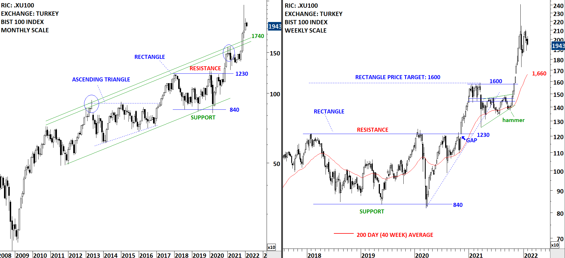Turkey’s BIST 100 equity benchmark cleared the resistance at 1,600 levels on weekly scale. Breakout above a rising trend channel (monthly scale) is usually followed by a runaway price action (strong rally). The upper boundary of the monthly scale price chart is at 1,740 levels that is expected to be support during pullbacks. The daily scale price chart shows a blow off top with the long upper shadow. I expect the index to consolidate and possibly pullback to the upper boundary of the rising trend channel.
